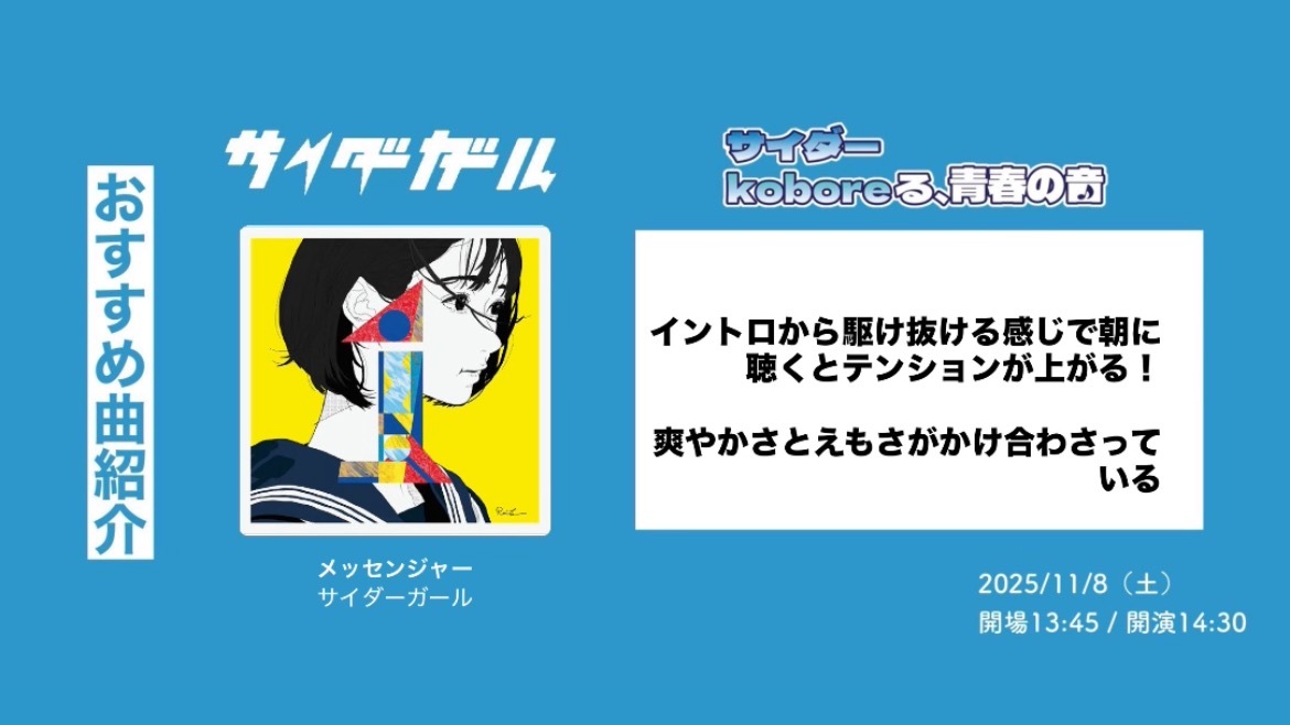 【#市大祭おすすめ曲紹介】 「メッセンジャー」/サイダーガール(@cidergirl_info) #サイダーガール #見放題 #市大祭 #市大祭ライブ #名古屋市立大学 pic.x.com/QzgjtiXHky