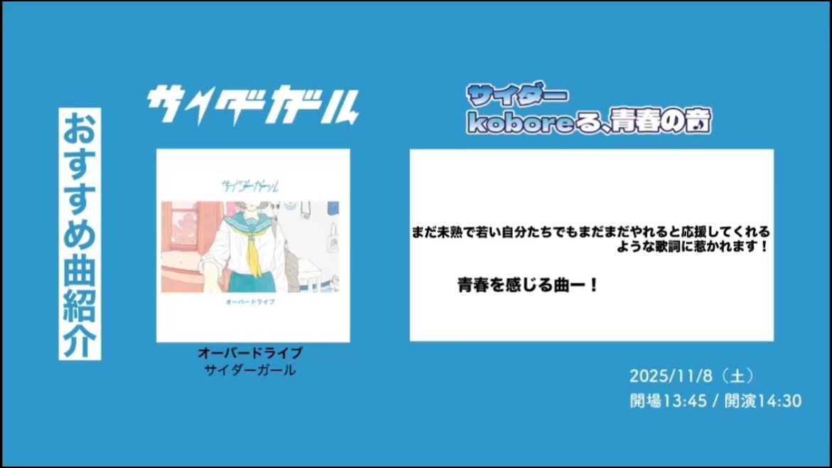 おすすめ曲紹介サイダーガール①【#市大祭おすすめ曲紹介】 「オーバードライブ」/サイダーガール(@cidergirl_info) #サイダーガール #見放題 #市大祭 #市大祭ライブ #名古屋市立大学 pic.x.com/CWOBGcLZ9M