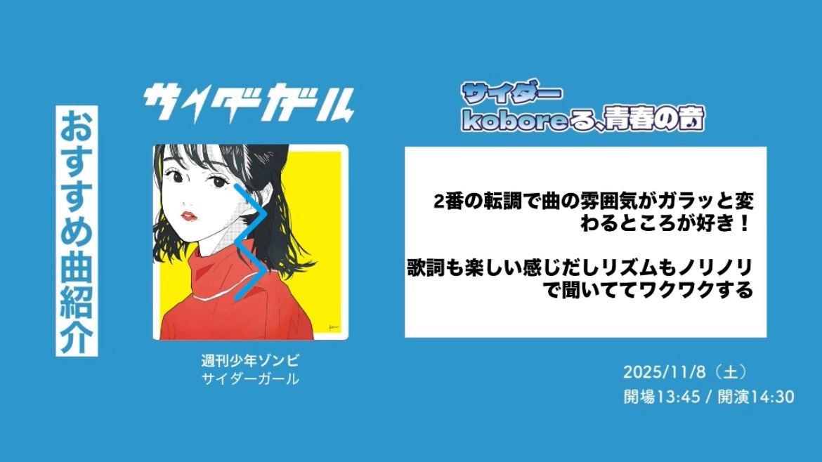 【#市大祭おすすめ曲紹介】 「週刊少年ゾンビ」/サイダーガール(@cidergirl_info) #サイダーガール #見放題 #市大祭 #市大祭ライブ #名古屋市立大学 pic.x.com/SVANUyC478
