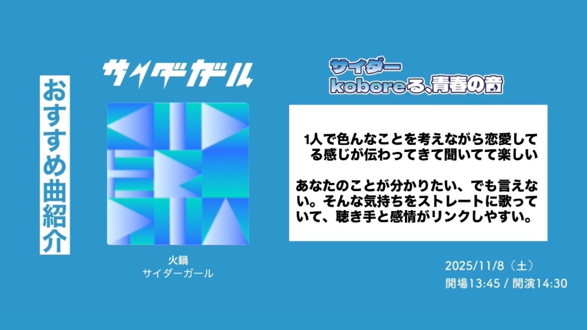 【#市大祭おすすめ曲紹介】 「火鍋」/サイダーガール(@cidergirl_info) #サイダーガール #見放題 #市大祭 #市大祭ライブ #名古屋市立大学 pic.x.com/TjTWmWwsIe