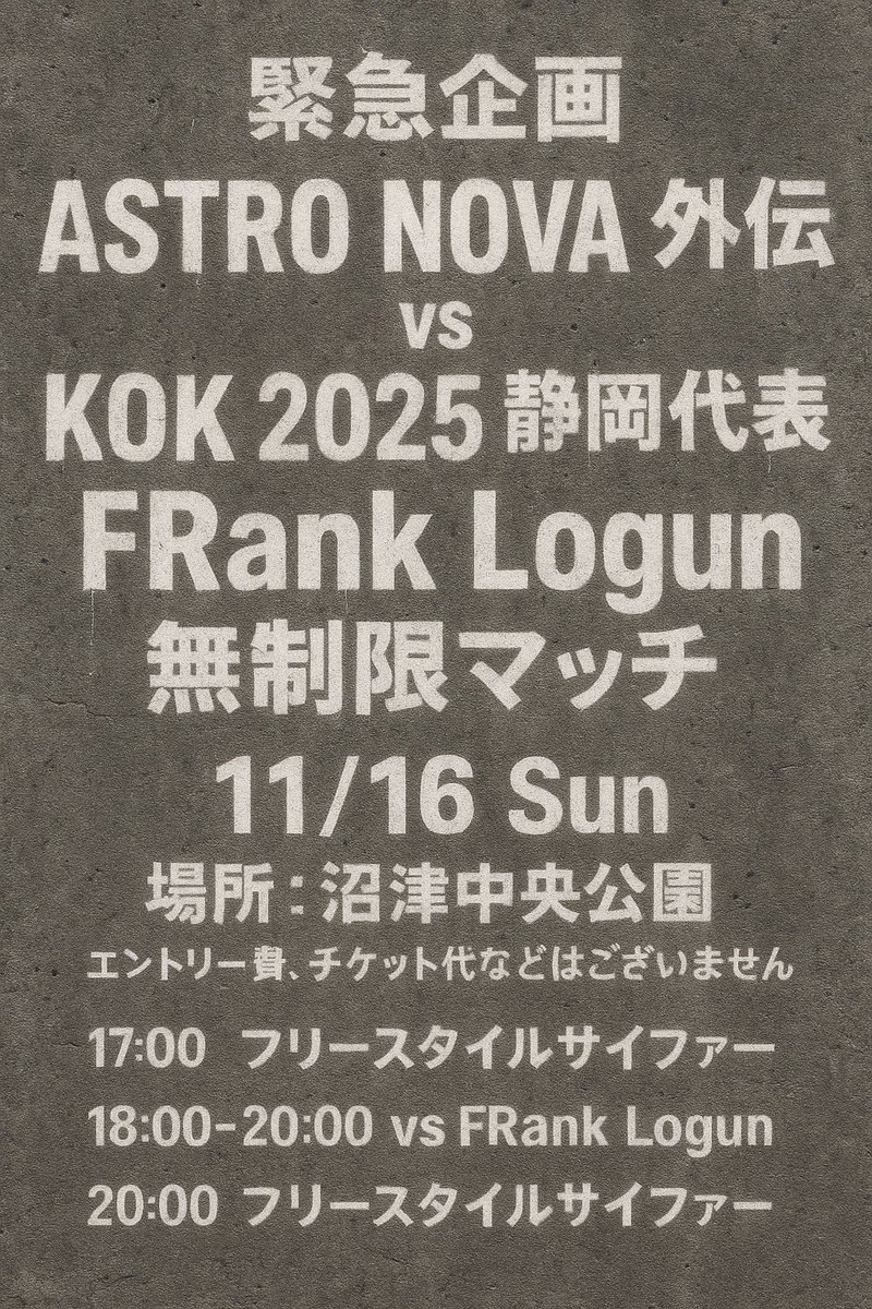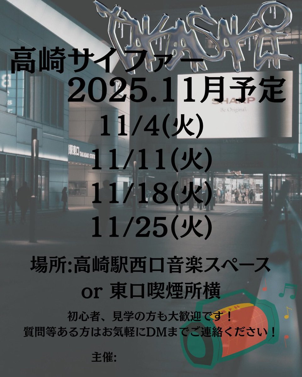 本日開催 🌊🌊 主催:@Takenoko_gnm 2025.11.11(火) 18:00~ 場所:高崎駅西口音楽スペース or 東口喫煙所横 初心者、見学者も大歓迎🙌 質問等あれば気軽にDMまでご連絡ください 時間ある人是非遊びに来てね〜! #サイファー #群馬 #ラップ #HIPHOP pic.x.com/gW2bFd8ugF