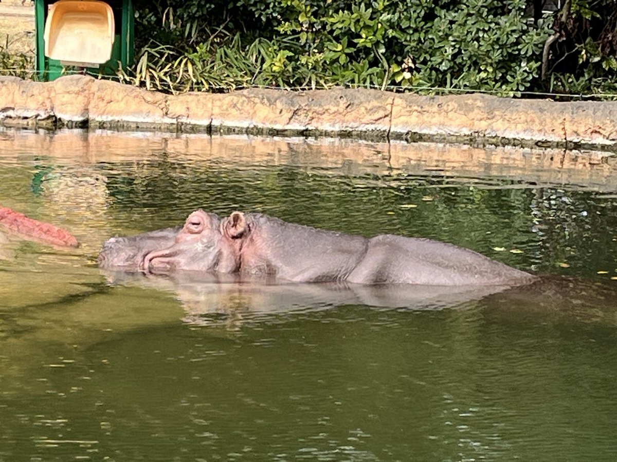 2025年11月11日10:40 カバ。 火曜日にプールに出ているということは、ミネとサツキ。 1頭はプールの中、もう1頭はお顔を岩の上にのせてのんびり中。気持ちよさそう。 #のんほいパーク #カバ #ミネ #サツキ pic.x.com/2N8J8pvHig