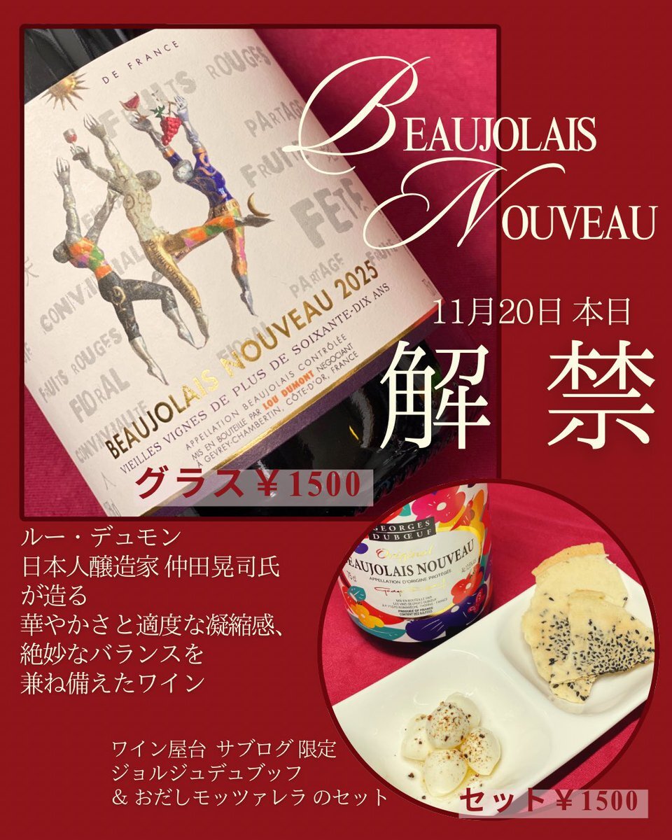 本日!ボジョレーヌーボー解禁🍷✨️ ワイン屋台サブログでは 毎年皆様が楽しみにしてくださっている、 #ルーデュモン をグラスで¥1500 #ジョルジュデュブッフ をセットで¥1500 にて、特別ご提供🍷 ぜひ、お試しください✨ #みろく横丁 #ワイン屋台 #屋台村 #ボジョレーヌーボー #ワイン