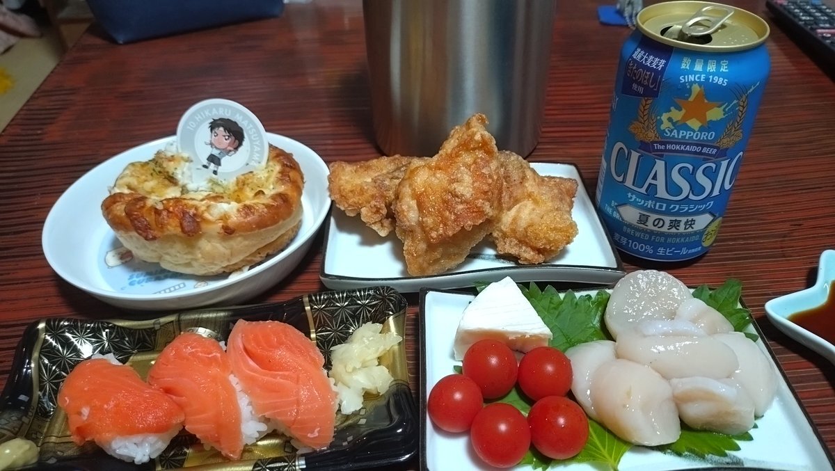 本日のはむほーの宴⚾️サッポロクラシック夏の爽快、まだ1本あった(笑)。サーモン寿司、トマト、青じそ以外は北海道関連✨。ホタテはnanacoポイントで購入(笑) 明日も勝つぞー‼️ #サッポロクラシック #はむほー #なるとキッチン #ザンギ pic.x.com/pqm03Q85bP
