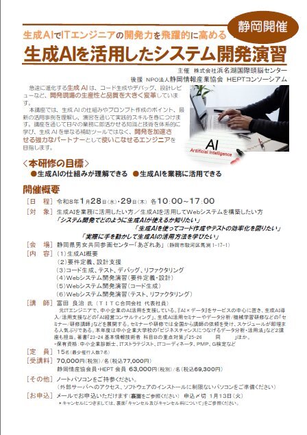 『生成AIを活用したシステム開発演習 静岡開催』1/28・29開催 hamanako.jp/info/0264.html 生成AIの仕組みや最新活用事例を知り、演習を通じて業務に即活かせる知識と技術を体系的に学び、生成AIを単なる補助ツールではなく、開発を加速させる強力なパートナーとして使いこなせるエンジニアを目指します。