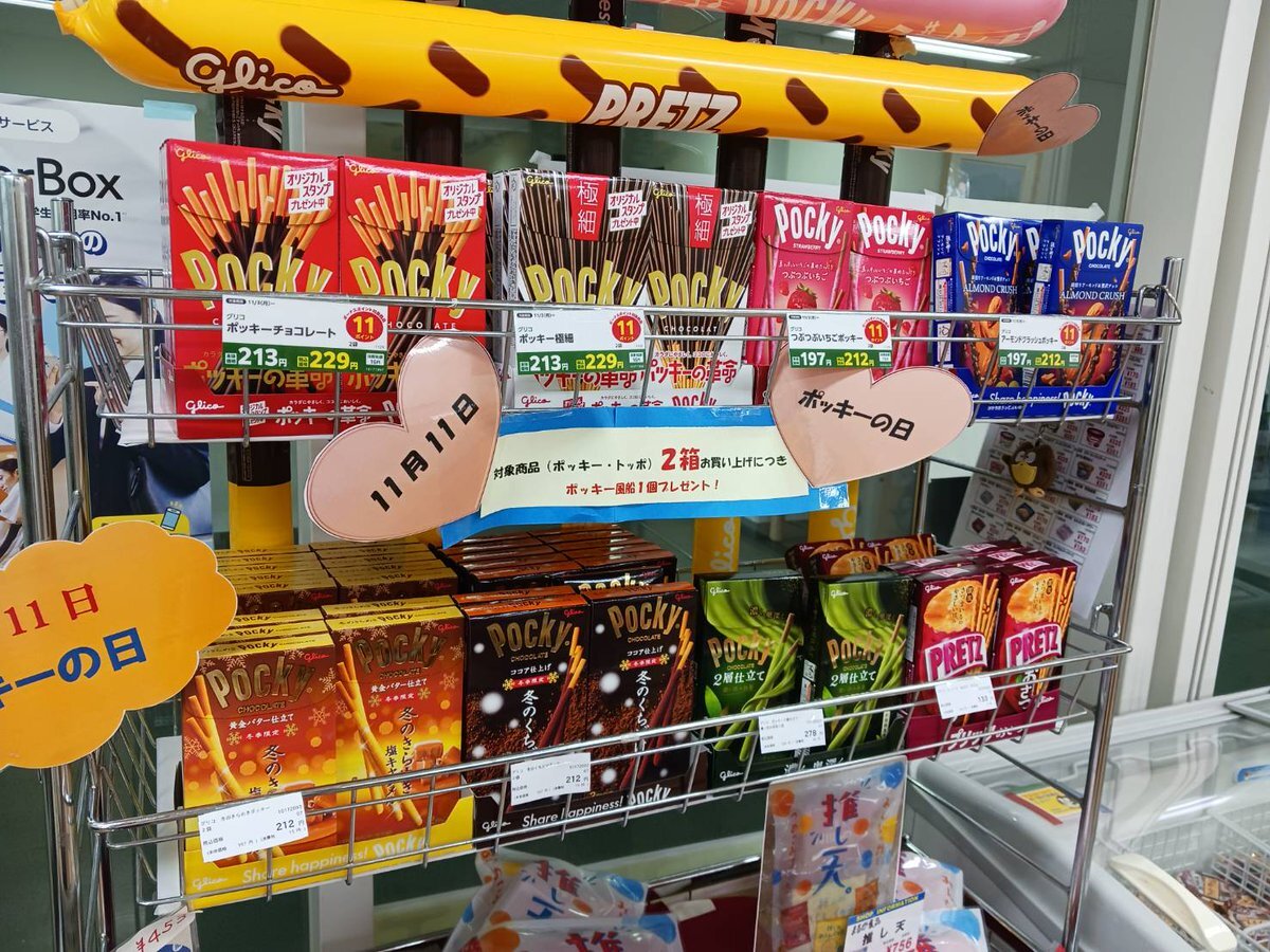 生協ショップですよ 明日は1111でポッキーの日ですよね! 実は、先週からフライングでポッキーコーナーを用意してます。 すでに手に入れた人もいますが、2箱以上買ってくれた人にはポッキー風船プレゼントです。 みなさんよいポッキーの日を~ #生協 #福山 #ショップ pic.x.com/RIOzuaermC