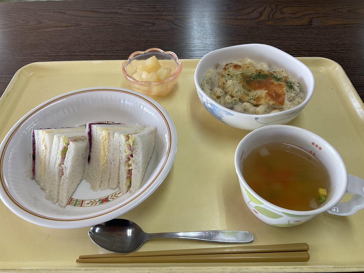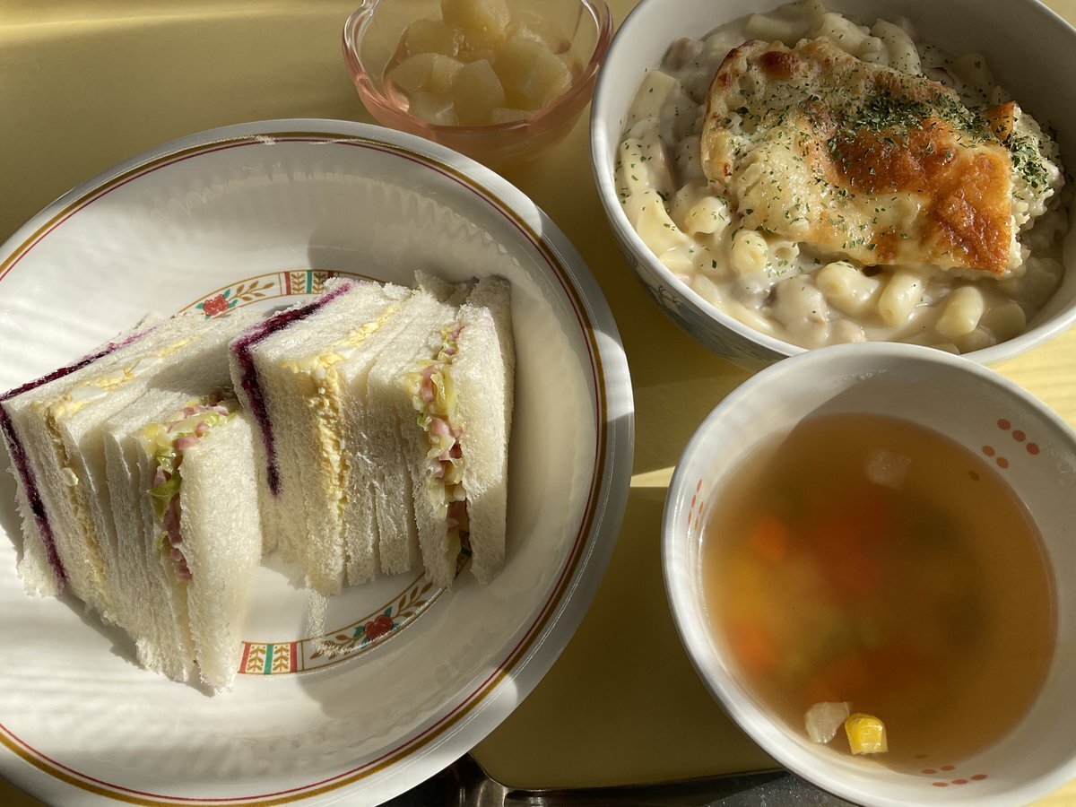 本日12月12日のくにたち苑の昼食はサンドイッチ、ミートグラタン、コンソメスープ、白桃缶です。 当施設では月に2回サンドイッチの昼食ご用意しています。 彩りやボリュームにこだわった献立となっております。 #特養 #デイサービス #ショートステイ #サンドイッチ pic.x.com/Te4v2u862s