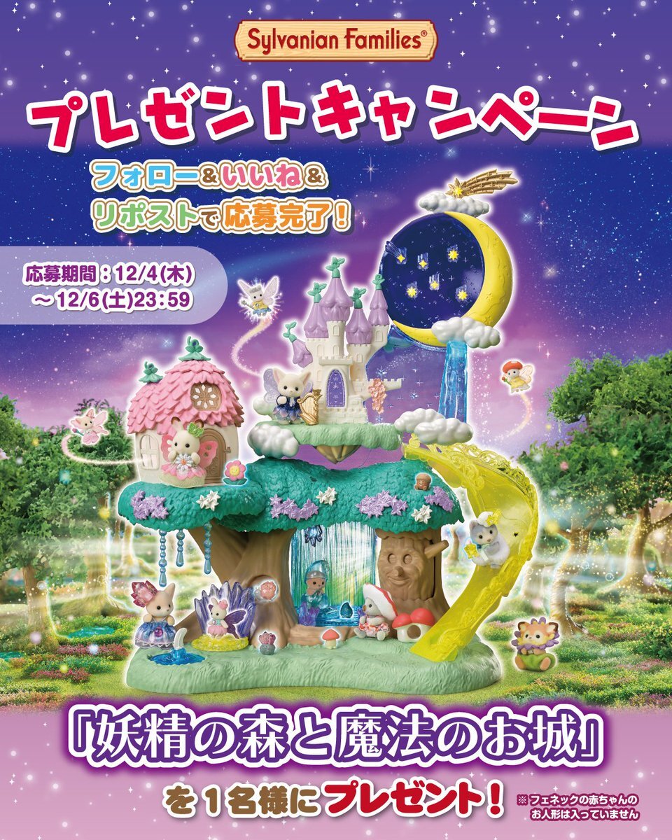 🎄#シルバニアファミリー #プレゼントキャンペーン🎄 このアカウントをフォロー&いいね&リポストで応募完了♪ 「妖精の森と魔法のお城」を抽選で1名様に #プレゼント🎁✨ 12/6(土)23:59〆切 #シルバニア #キャンペーン #プレゼント #フェアリーシリーズ #妖精 #妖精さん #魔法 pic.x.com/21qJARet5v