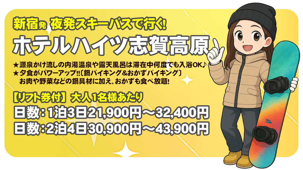 新宿(23:00)出発🚍 夜発スキーバスで行く! 横手山・渋峠スキー場 リフト券付🎟️ ホテルハイツ志賀高原🏨宿泊パックに注目です🏂 スキー・スノボツアーを探してるならオリオンツアー➡orion-ski.jp/tourtype/hotel…
