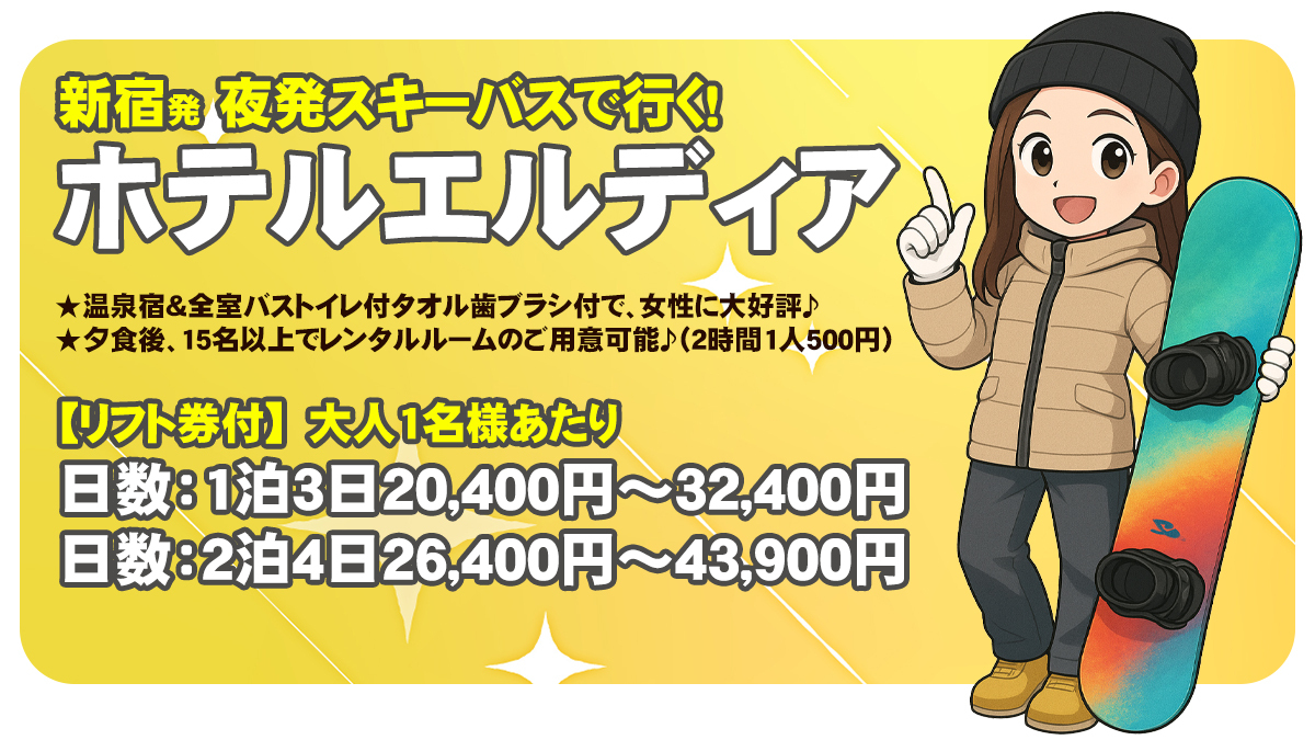 新宿(23:00)出発🚍 夜発スキーバスで行く! 斑尾マウンテンリゾート(斑尾高原&タングラム) リフト券付🎟️ ホテルエルディア🏨宿泊パックに注目です🏂 スキー・スノボツアーを探してるならオリオンツアー➡orion-ski.jp/tourtype/hotel…