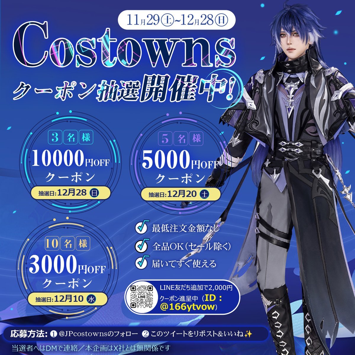 🎉Costowns クーポン抽選 開催中‼️ 全品OK/最低注文金額なし/商品と直接交換可能 期間:11/29 – 12/28 当たる🎁 12/10 → 3,000円 ×10名 12/20 → 5,000円 ×5名 12/28 → 10,000円 ×3名 📲 応募方法:@JPcostownsのフォロー&このツイートをリポスト&いいね✨ ▶ costowns.com/activity/5.html #抽選