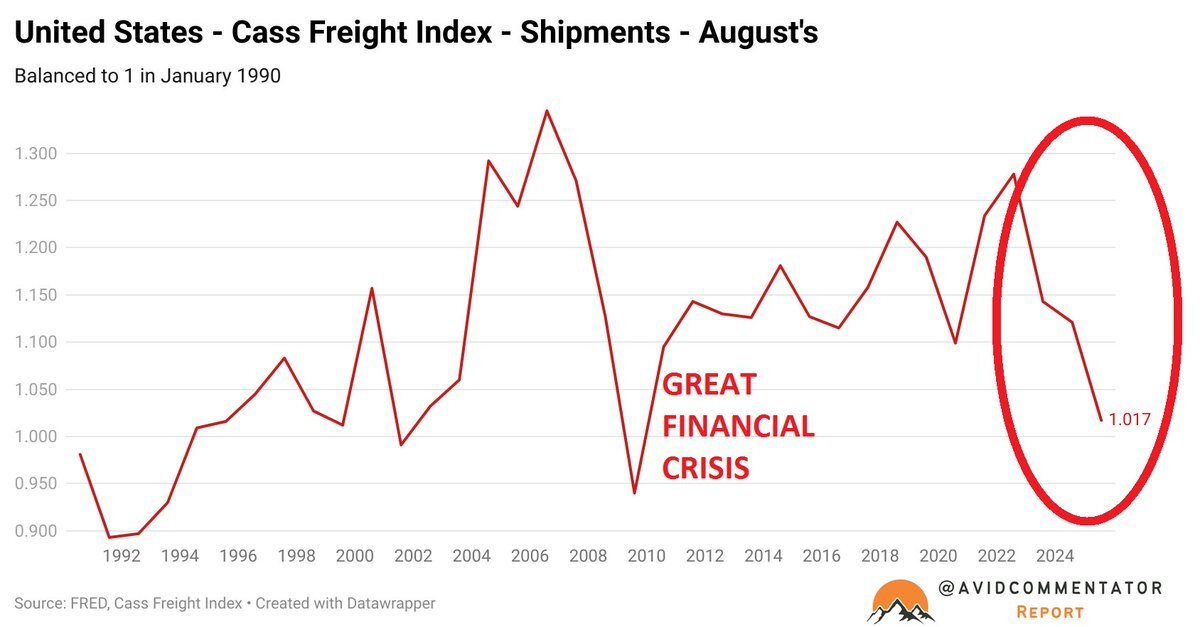 ‼️US FREIGHT RECESSION is getting worse: The Cass Freight Index, a key measure of freight volumes, fell in August to the lowest since the Financial Crisis. Weak consumer spending, housing, and industrial activity continue to hit demand. The real economy is in a recession...