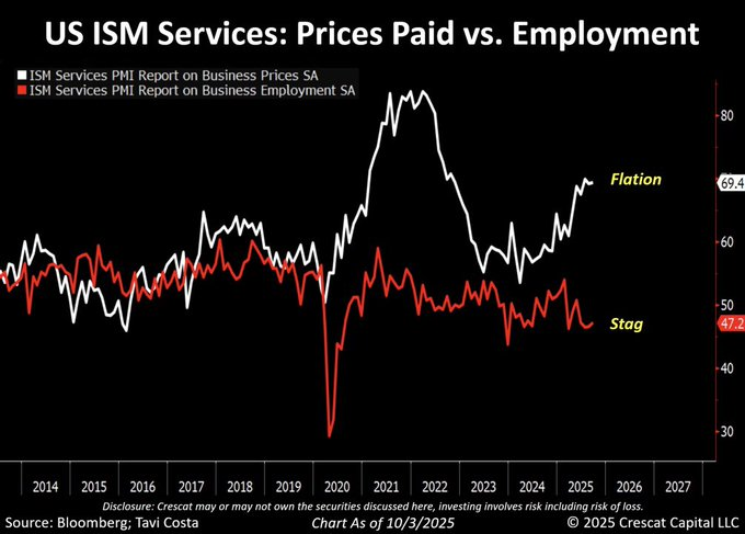 Rate cuts into stagflation: The latest ISM Services report showed prices paid rising toward 70 and employment remaining below 50. As a result, we are now seeing the biggest gap between prices paid and employment since the 2020 Pandemic. Asset owners know this. x.com/KobeissiLetter…