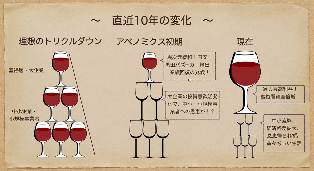 株価にもこの図があてはまるかもしれんが、 トリクルダウンを阻止した経済界・大企業・ (アベノミクス推奨)政府が、日本の様々な問題の元凶なんやで ( ゚Д゚) 下の庶民は困ってるでしょ? 図の拝借先は『alliizuka.org』 #円安 #内閣府 #日銀 #アベノミクス #経済界 #トリクルダウン理論