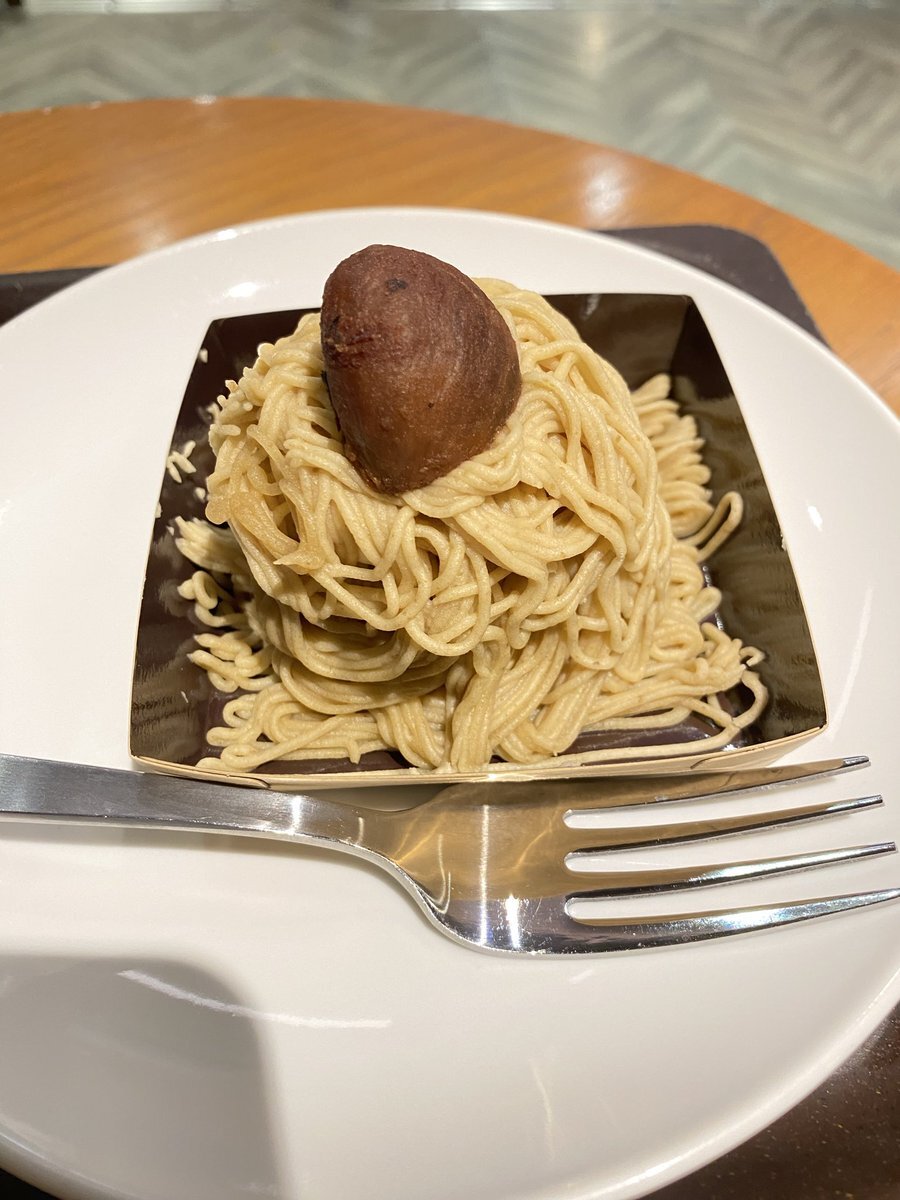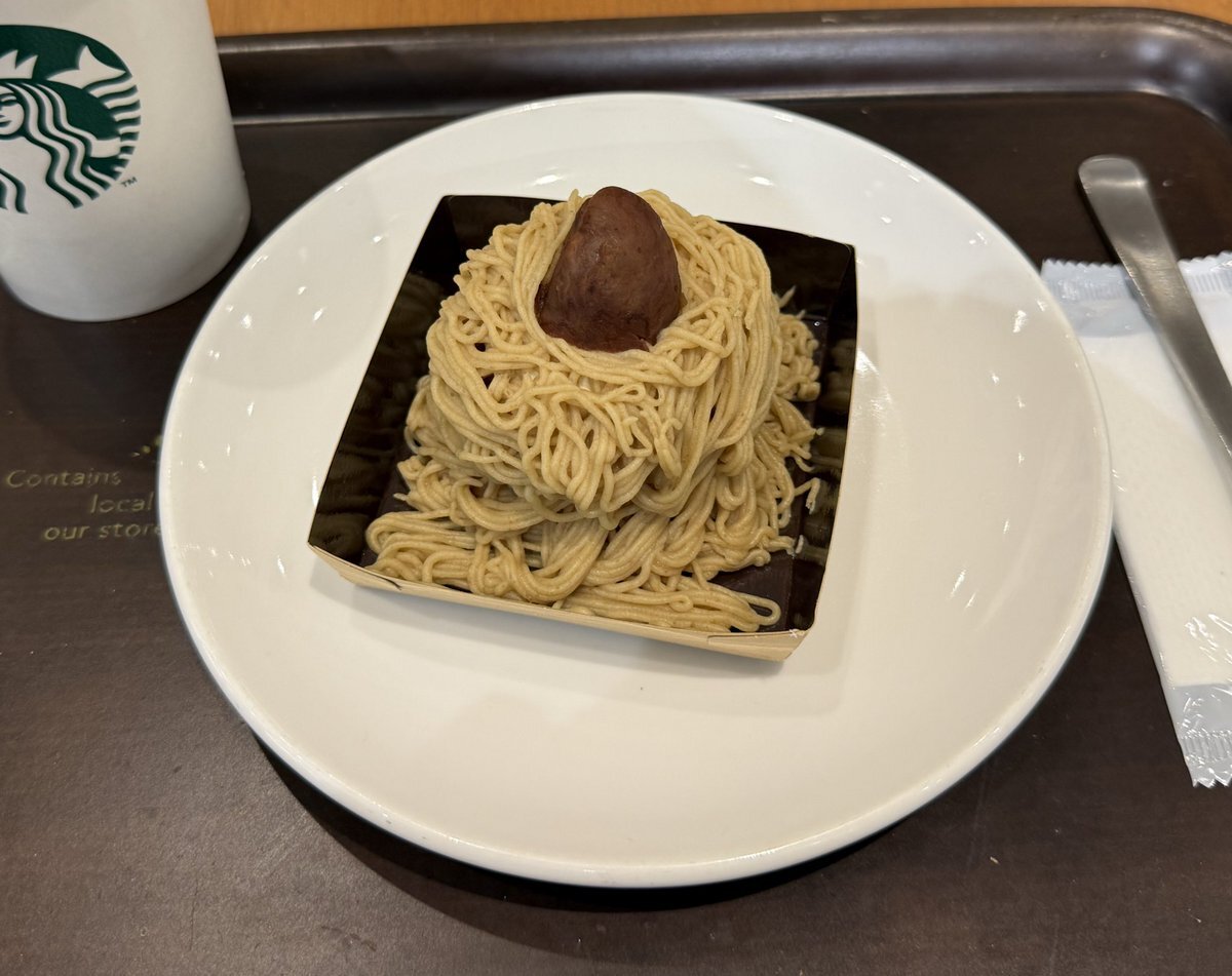 #スイーツ賞味 #スターバックス #モンブラン 商品名 手しぼり栗のモンブラン 評価 3.5/5 モンブラン度 3.5/5 リピート 一度でよい。 熱量 289kcal(脂質12.2g コメント 説明文にない、メレンゲじゃない(ような)ザクザク感、フレーク感との組み合わせが◯美味しかった。なんだったんだろう…。 pic.x.com/AfGS25FtuB