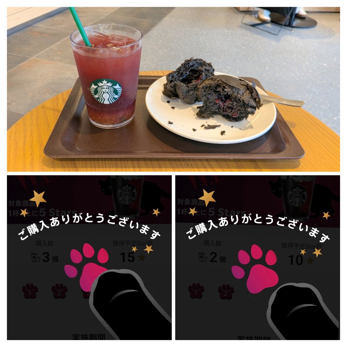 1CUP 5STARSの猫ちゃんのアニメーションを見るためにスタバの新作「アサイーベリーゆずシトラス&ティー」と「ハロウィンチョコ&ベリーデニッシュ」を注文してみた。ドリンクは氷少なめ+ティー多めにしたけどまだまだ甘い。デニッシュは美味しいけど350円は高いと思う。 #スターバックス pic.x.com/PA9qCbeIUF