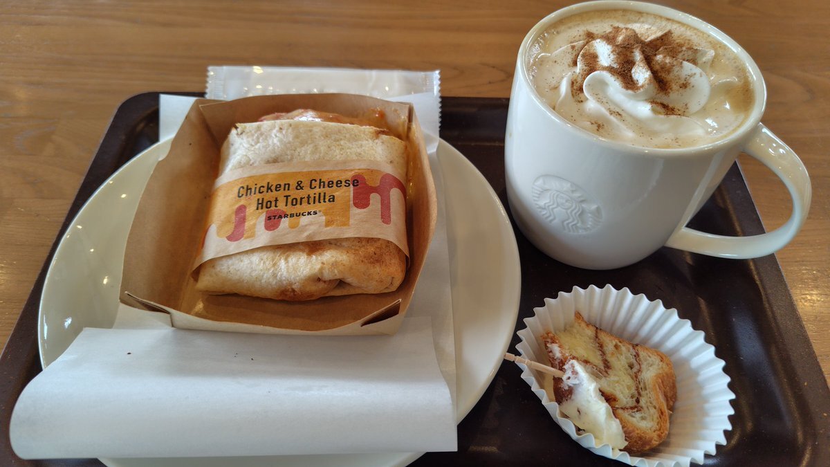 #今日のお昼ご飯 #スターバックス #Starbucks #パンプキンスパイスラテ #チキン&チーズホットトルティーヤ 前回飲んだのが美味しかったのでリピート おまけに #シナモンロール がついてきた。ラッキー✌️ pic.x.com/sAxsi3wBfx