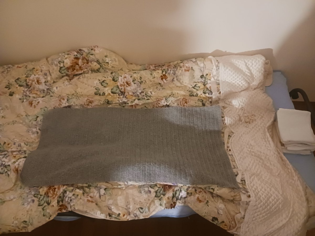 ネッ友にお願いされて、編んだストール何ですが、初めてにしてはいい出来じゃないですかね 写真のベットは大きさの比較のためです #棒針編み #ストール #ハンドメイド #編み物 pic.x.com/sYNcyQvg0h