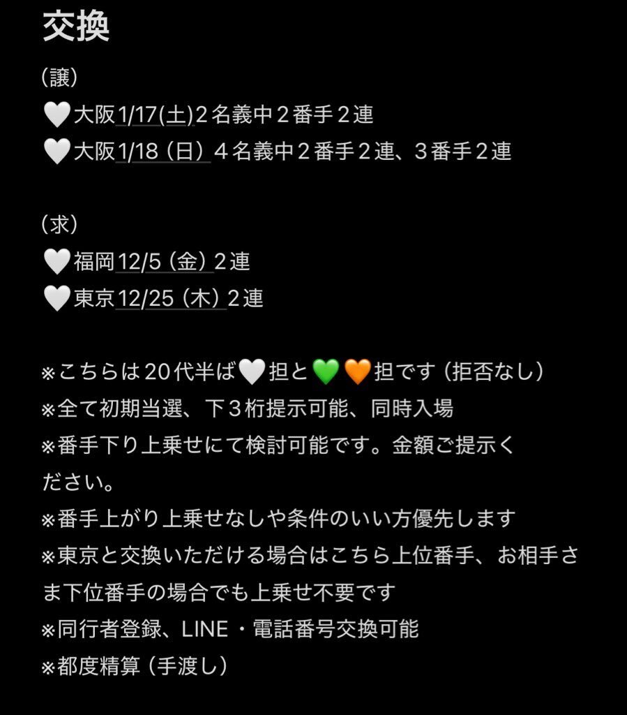 Snow Man Dome Tour 2025-2026 ON 交換していただける方を探しています。 【譲】名古屋1/5 2連 【求】大阪1/18、東京12/25 名古屋 1/6.7 各2連 2名義重複/有効期限内/下3桁提示可 同条件の交換探しております。 お心当たりございましたらDMまでお願いいたします #SnowMan交換 #スノ交換 #ON交換