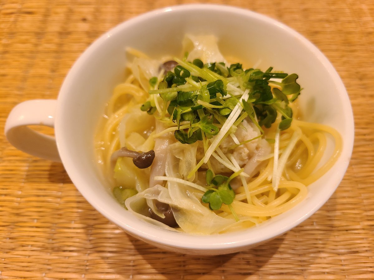 🍝25年 家パスタ 212皿 #キャベツと鶏の肉団子スープスパゲティ このサイズは朝食用にピッタリ.栄養バランスもそこそこGood!😋(250915) ●🇹🇷PROSSIMO スパゲッティ 1.6mm ●🥣キャベツと鶏の肉団子スープ ●🥬かいわれ大根 ●🍄しめじ #パスタ #家パスタ #スパゲティ #スープスパゲティ pic.x.com/nseqFf0S8G