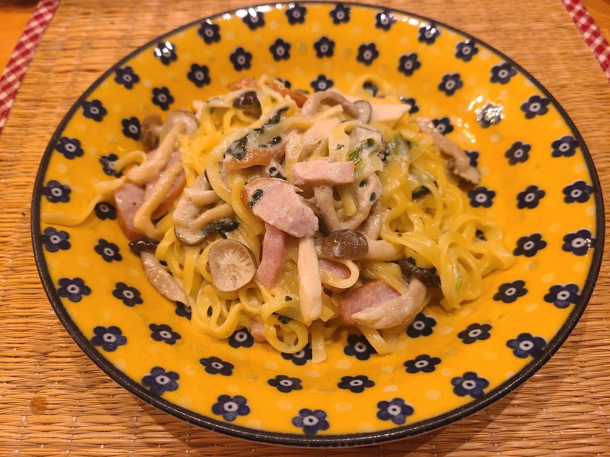 🍝25年 家パスタ 217皿 ほうれん草としめじとベーコンのクリームスパゲティ (250923) #パスタ #家スパ #スパゲティ #生パスタ #クリームスパゲティ pic.x.com/l5CqipOawF