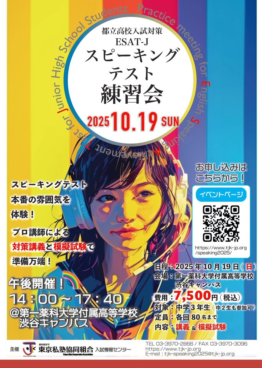 明日締切! 東京私塾協同組合主催「スピーキングテスト練習会」を開催します。毎年「ためになった!」という声を多数いただいています。 詳細:tjk-jp.org/speaking2025/ 日時:10月19日(日) 14:00~17:40 会場:第一薬科大学附属高校(渋谷駅南口より徒歩5分) #都立高校 #スピーキング pic.x.com/RdqO97cl8z