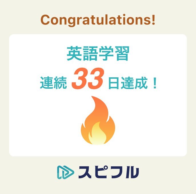 #Versantチャレンジ 『スピフル』アプリで連続33日目の学習をしました! #スピフル #口頭英作文 #瞬間英作文 #独り言英会話 #スピーキング #英語学習 #1日1スピ pic.x.com/7QC2wbWEOb