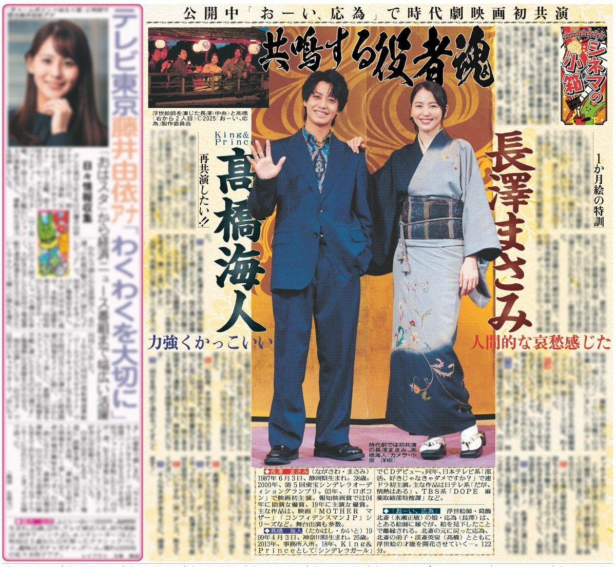 10月20日 #スポーツ報知 『#シネマの小箱』 #長澤まさみ が映画「#おーい応為」で時代劇初主演。同じく時代劇初挑戦となったKing&Princeの #髙橋海人 とインタビューに応じ、お互いの俳優としての魅力や、再共演への思いを語り合った。 <首都圏>版に掲載。 #ドラゴン桜 以来の共演 #KingandPrince pic.x.com/qEI2xkpmpv