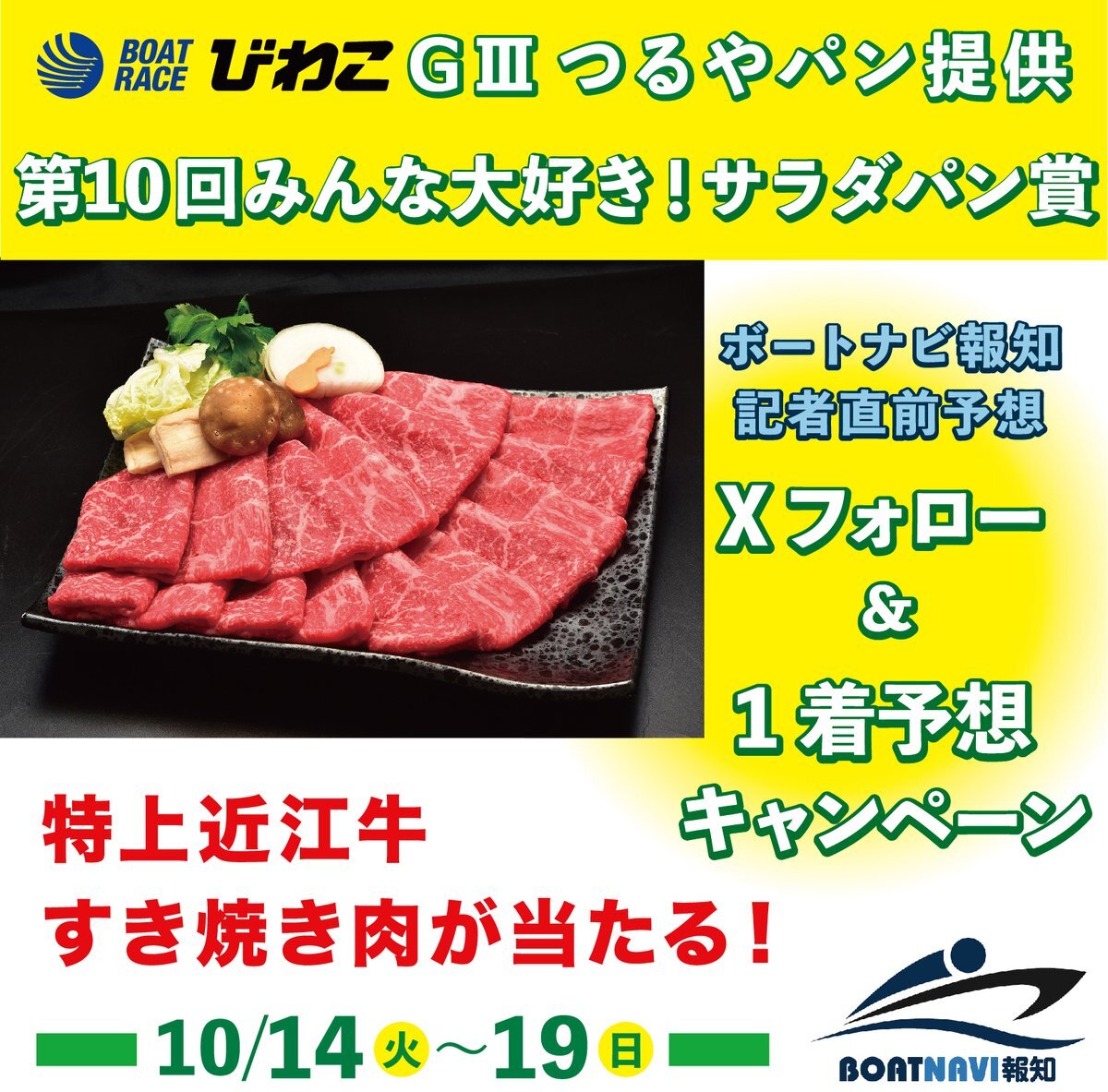 \🥩 #近江牛 が当たる😋/ 🚤ボートレースびわこ🚤 「GⅢつるやパン提供 第10回みんな大好き!サラダパン賞」 プレゼントキャンペーン14日スタート😄 ★賞品★ ・特上近江牛(すきやき肉1kg)…6名 ※各日1名ずつ ★参加方法★ ①本アカウント&@br_biwakoをフォロー