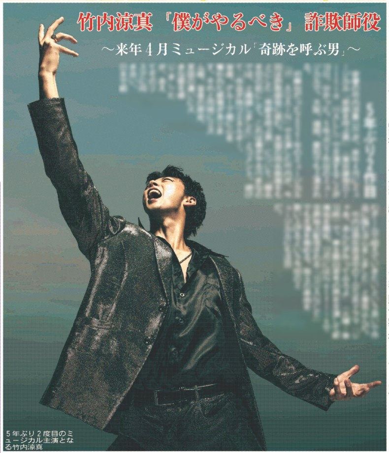 10月20日 #スポーツ報知 #竹内涼真 が、来年4月にミュージカル「#奇跡を呼ぶ男」で主演することが分かった✨初舞台だった「#17_AGAIN」から5年ぶり2作目のミュージカルで、詐欺師役に挑む意気込みを語った。 #じゃああんたが作ってみろよ #10DANCE pic.x.com/gHllP6dFF1