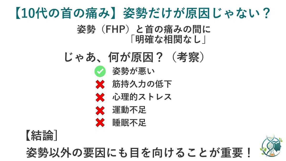 首の痛みは姿勢のせい。そう思いがちですが、研究では10代の姿勢の悪さと首の痛みの間には、明確な関連が見られませんでした。つまり姿勢以外の ・筋持久力の低下 ・心理的ストレス ・睡眠不足 などが痛みの引き金になっている可能性が。 多角的なケアが必要ですね。 #心身健康ラボ #スマホ首 pic.x.com/MLKRlMQAs3