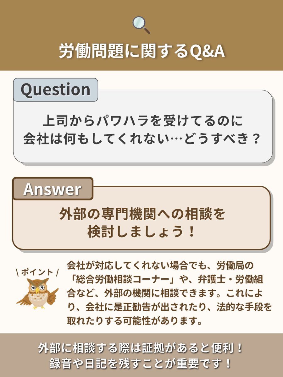 【労働問題に関するQ&A🤔】 Q. 上司からパワハラを受けているのに、会社に相談しても何もしてくれない…どうしたらいい? 😭 A. 外部の専門機関への相談の検討を! 詳しくは画像をタップ!👇 #パワハラ #セクハラ pic.x.com/LUuRAUYm5R