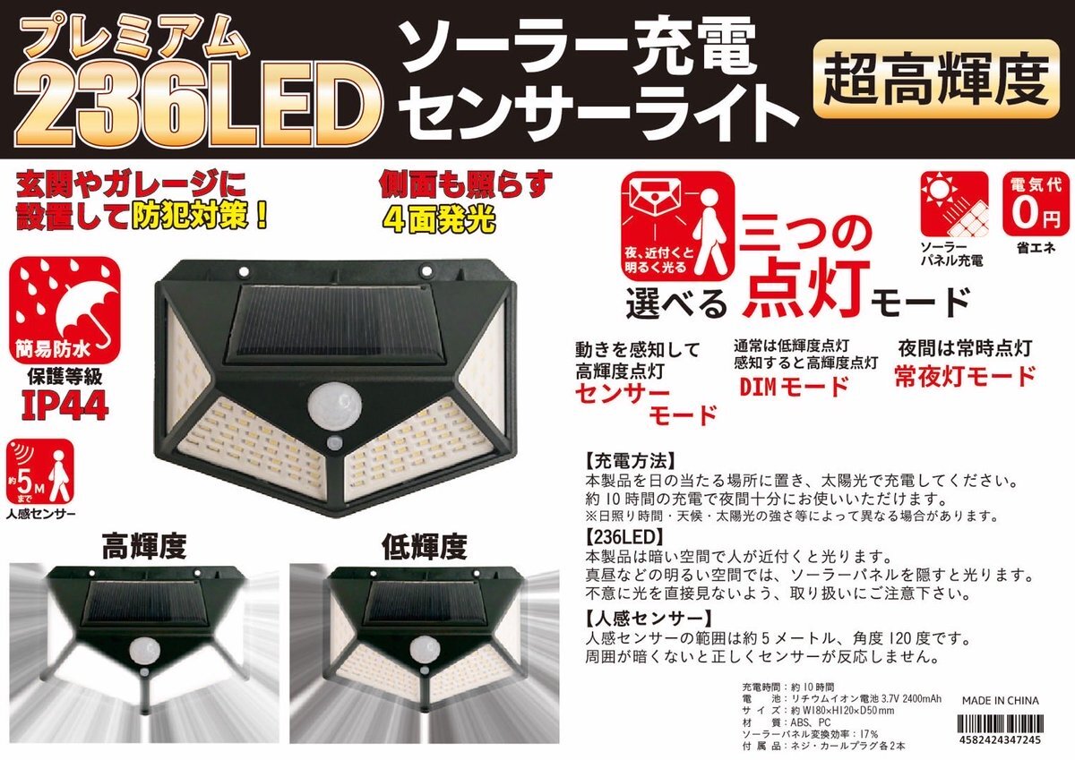 236LEDソーラー充電センサーライト 超高輝度 玄関、庭、廊下、物置、ガレージ、ガーデン、縁側、駐車場など場合で防犯や照明に最適です。 本体価格999円(税込1098円) #236LED #センサーライト #センサー #ソーラー充電 #4面発光 #超高輝度 #防犯 #省エネ #電気代節約 #茨城県 #那珂市 #ふくや pic.x.com/bqjXQL2Jj2