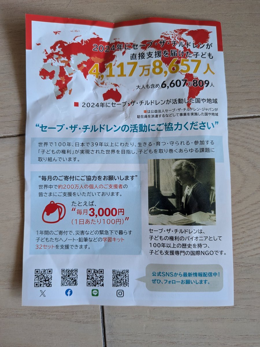 郵便局のATMでお金を下ろしてたら「恵まれないこどもに募金お願いします」ってこの紙渡されたんだけど、ATMコーナーで声掛けるって詐欺じゃない?そもそもATMコーナーでそんなことしていいの?郵便局の人じゃなかったし、次もいたら通報しよ。 #セーブ・ザ・チルドレン pic.x.com/ZEuzd88opb