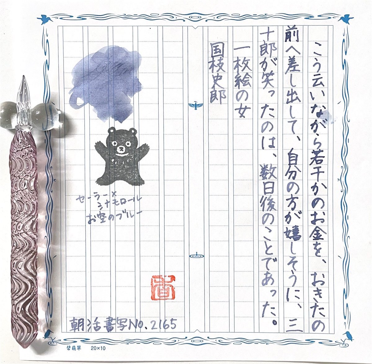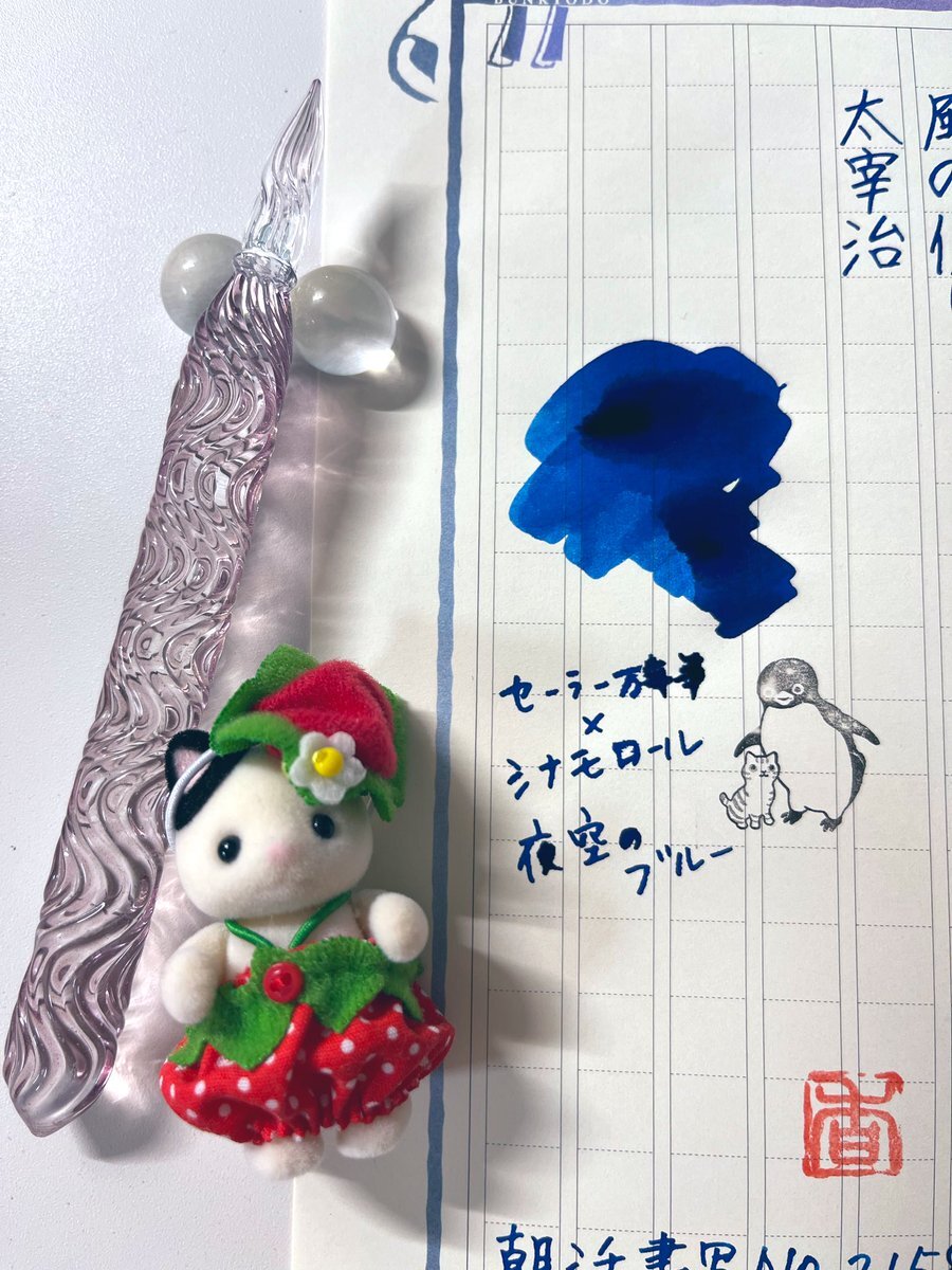 お題ありがとうございます。 今夜は、ここのところ手をつけられなかった、モチーフ編みの糸始末を頑張るぞᕦ(ò_óˇ)ᕤ (TVを見ながらだけれど...😛) ✒︎#HASE硝子工房 流水ショート 🎨#セーラー ✖️シナモロール 🐻#とみこはん #飾り原稿用紙 #朝活書写 #朝活書写_2165 pic.x.com/bIpSRnx3OJ x.com/asakatsu_shosh…
