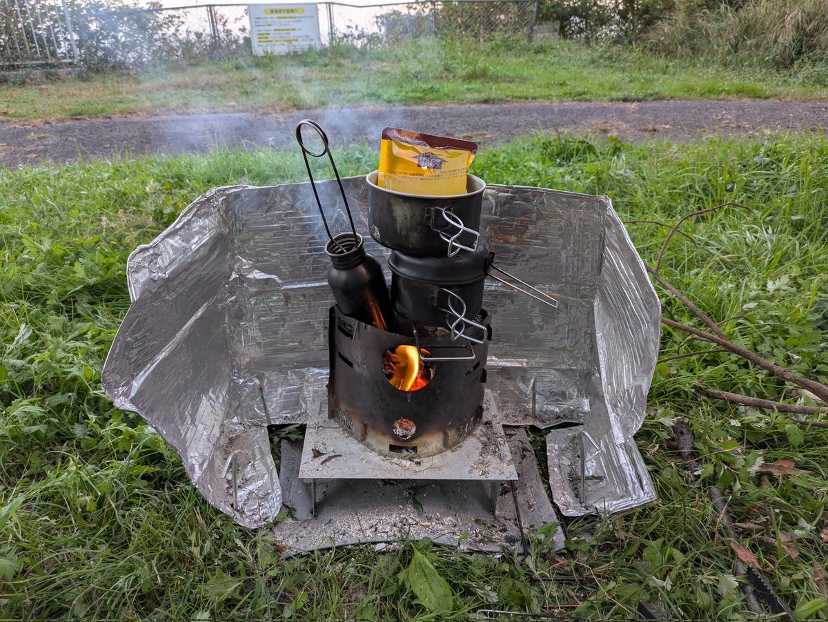 固形燃料1/3くらいで250mlくらいは沸騰しない程度に。珈琲は沸騰する前の温度が美味しいから。 本日300泊目のキャンプ開始に… カンパィニョーロ!! #自転車キャンプ #ソロキャンプ pic.x.com/HaS6caNzut x.com/sir_altria_jp/…