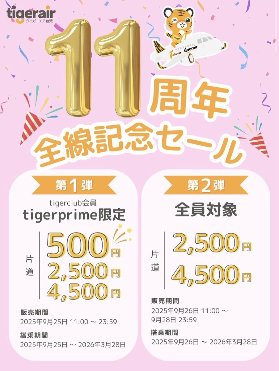 11周年セール攻略まとめ。9/25はtigerprime先行、9/26–28は一般。日本発片道500/2,500/4,500円(燃油込・諸税別)想定。事前準備が勝負👉 ifelog.com/travel/travel-… どこ狙う? #タイガーエア台湾 #LCC #セール #台北 #台中 #高雄 #ifelog