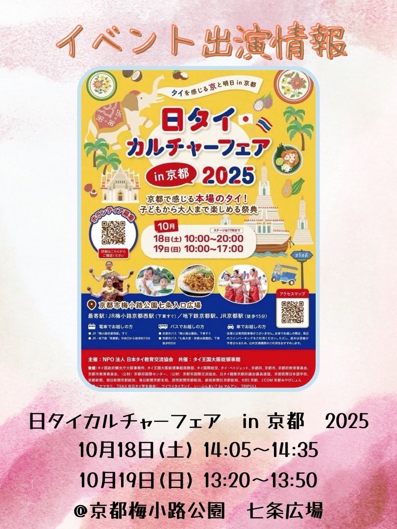 📣イベント出演情報📣 日タイカルチャーフェア in京都 2025 10月18日(土) 14:05〜14:35 10月19日(日) 13:20〜13:50 📍京都梅小路公園 七条広場 よさこい曲だけでなく、タイの楽曲も踊ります♪ タイを味わえる素敵なイベント🇹🇭ぜひお越しください! #いなせもん #よさこい #タイフェス pic.x.com/u5JPImNRiv