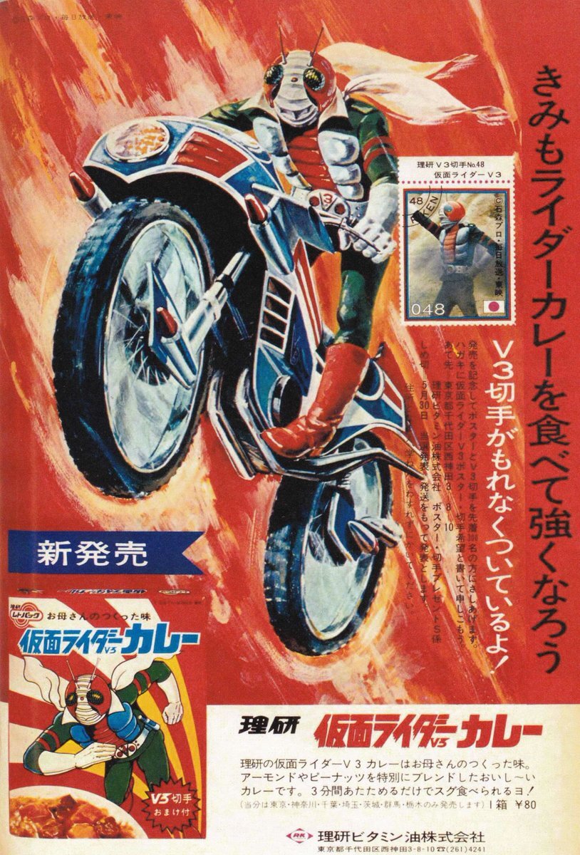 #タイムラインをあたかも昭和にする リクエストがありましたので、仮面ライダーカレー❣️ おまけが切手なのがいかにもあの頃らしいですね☺️ クラスに切手集めている子が何人かいました❣️雑誌の裏表紙の広告とかお馴染みでしたね❣️ 私様はこのV3カレー食べたことないです💦甘口ですか❓ pic.x.com/ChPreK6iRp