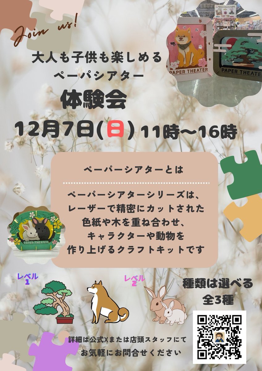 【イベント】帰ってきた☆ ペーパーシアター体験会~パワーUP~ という事でご好評いただいている 体験会がさらに楽しくなって再開催☆ 是非お気軽にご参加ください♡ 開催日程 12/7(日)11時~16時 #ペーパーシアター #エンスカイ #タムタム相模原店 #タムタム相模原 pic.x.com/PCi6iUNt9k
