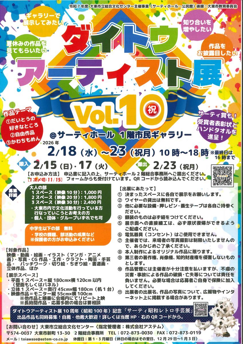 2/18〜23【ダイトウアーティスト展Vol.10】(出展者募集中❗️) フォームからもお申し込みできます! x.gd/gze2k #大東市 #ダイトウスタイル #サーティホール #ダイトウアーティスト展 #10周年 #ありがとうございます pic.x.com/37Ot1cSDHV