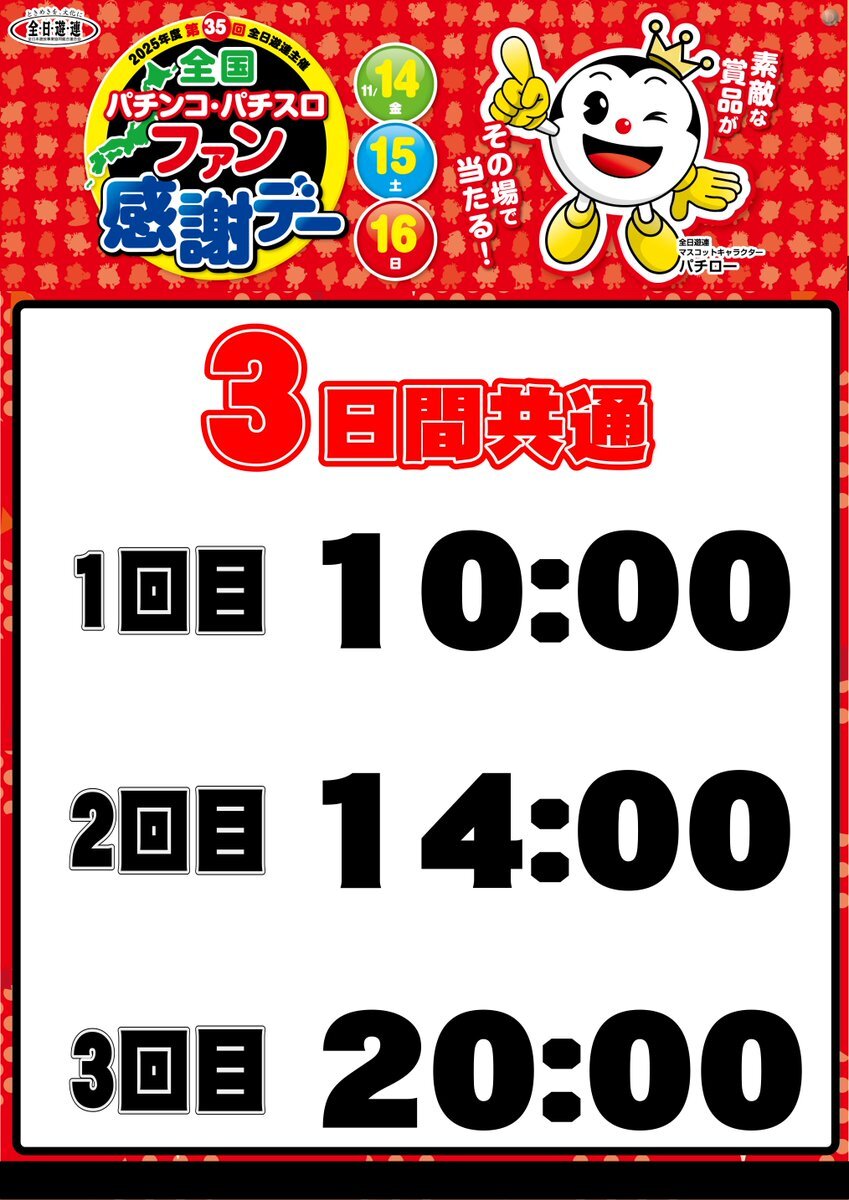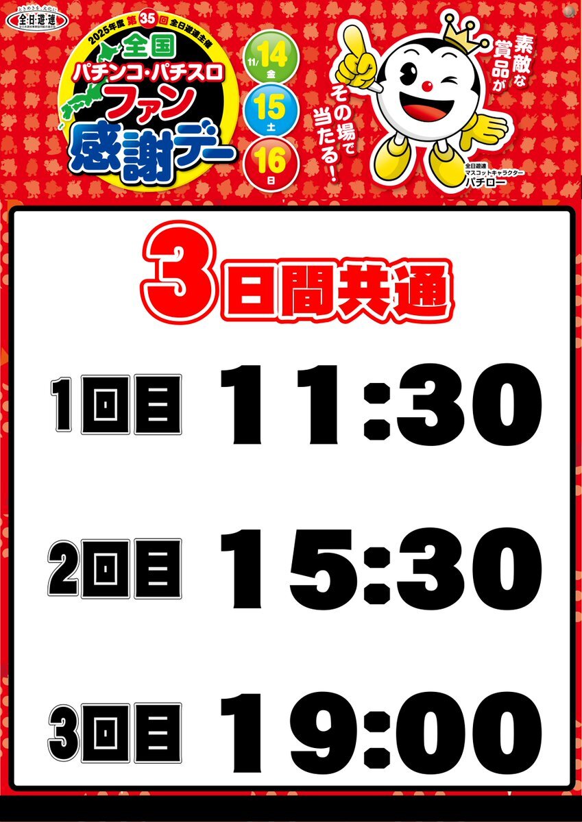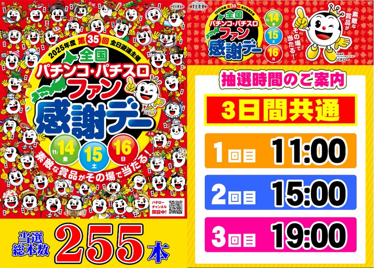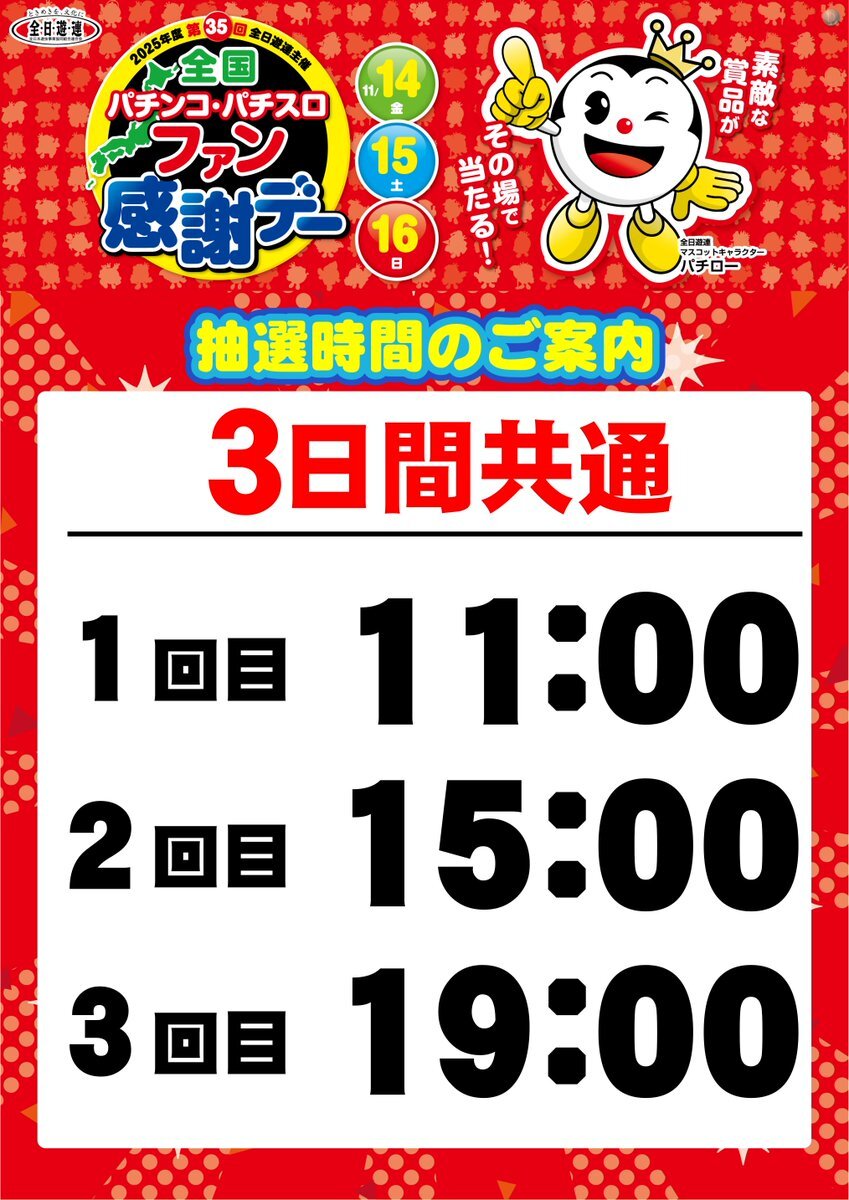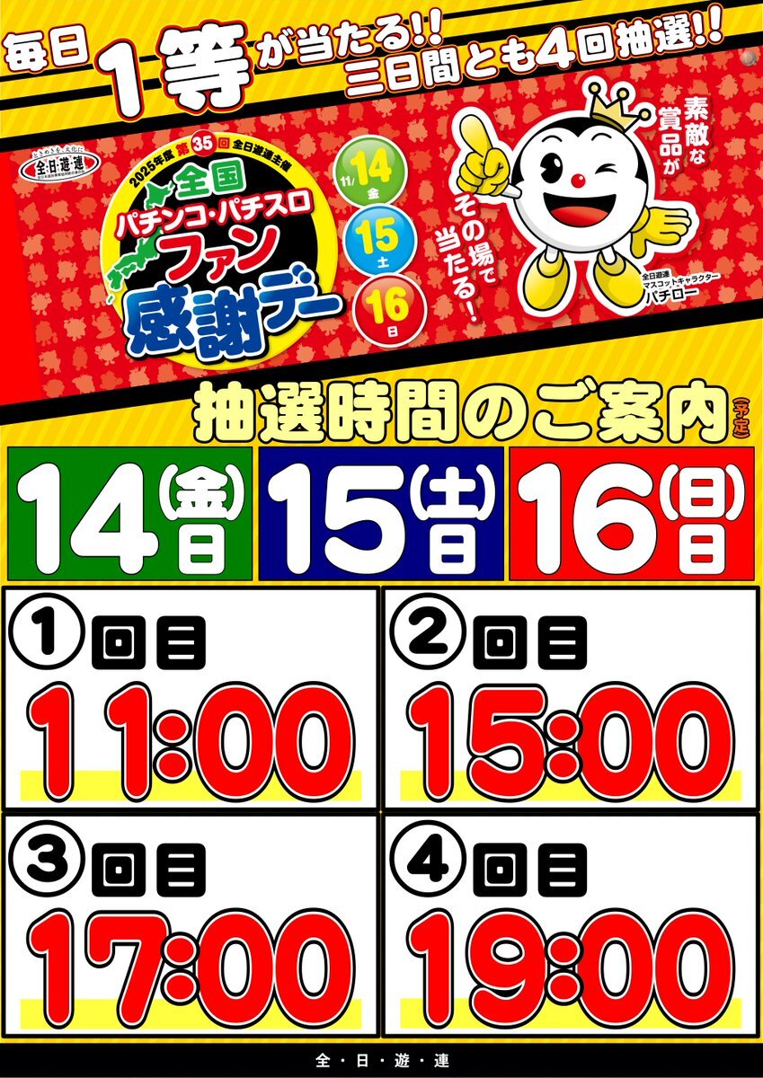 11月14日~16日までの3日間は 全国パチンコ・パチスロ ファン感謝デー!! なんと!当たり総本数は255本! 抽選は 1回目 11:00 2回目 15:00 3回目 19:00 の3回実施♪ 3日間で合計9回実施します♪ ぜひご来店下さいませ(*´ω`*) #ダイナム #ファン感謝デー pic.x.com/s2pnmIfXBC