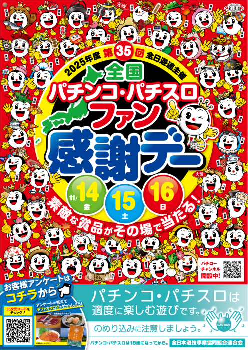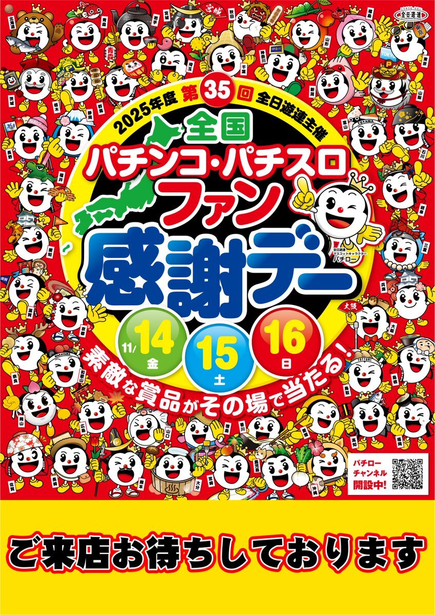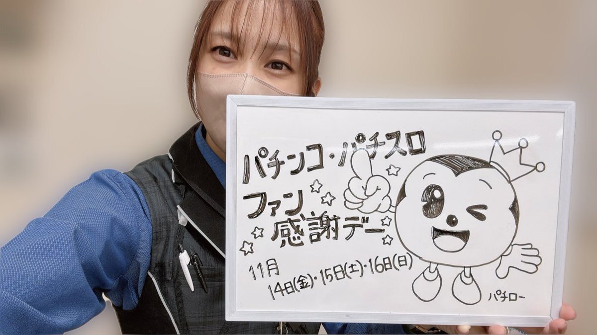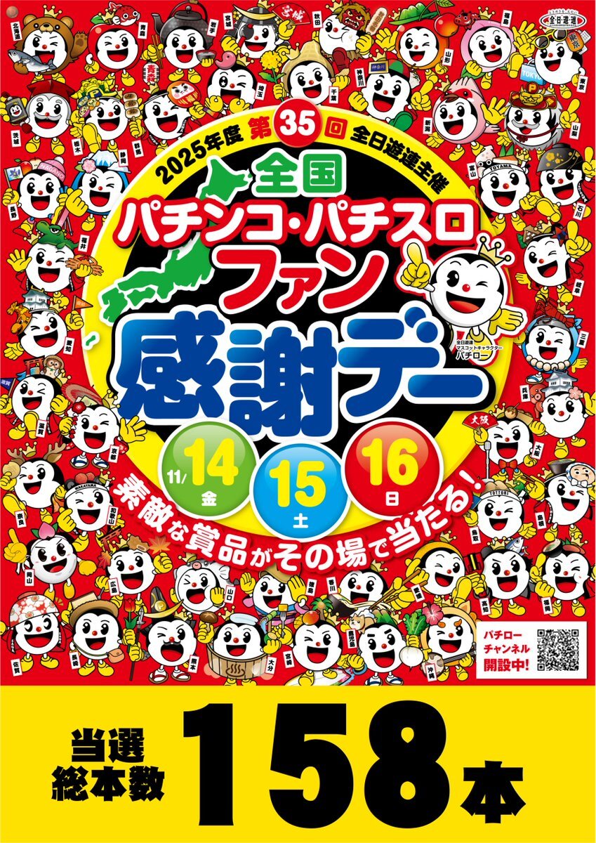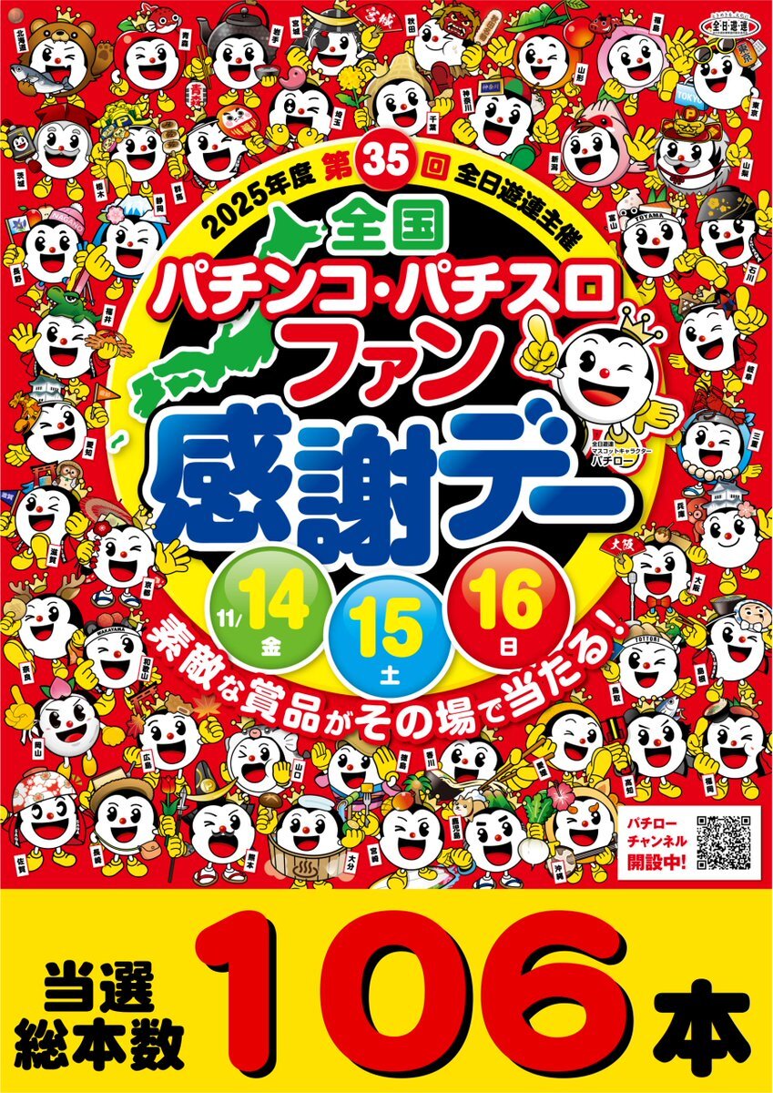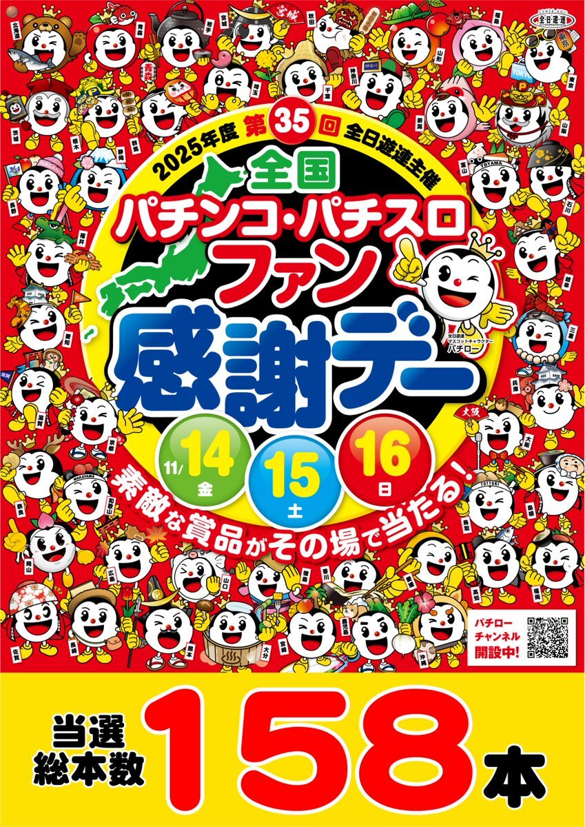 11月14日~16日までの3日間は 全国パチンコ・パチスロ ファン感謝デー!! なんと!当たり総本数は255本! 抽選は 1回目 11:00 2回目 15:00 3回目 19:00 の3回実施♪ 3日間で合計9回実施します♪ ぜひご来店下さいませ(*´ω`*) #ダイナム #ファン感謝デー pic.x.com/s2pnmIfXBC