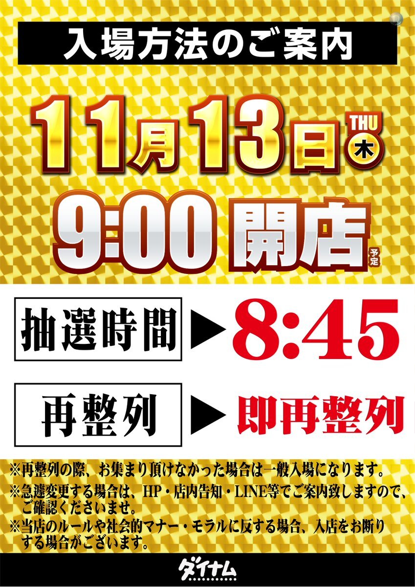 こんばんわ 北斗七重浜店です。 11月13日(木) 【9:00開店】(予定) 抽選時間【8:45】 再整列【即再整列】 ぜひお待ちしております。 #ダイナム #北斗市 pic.x.com/j7ZfdkBIJr