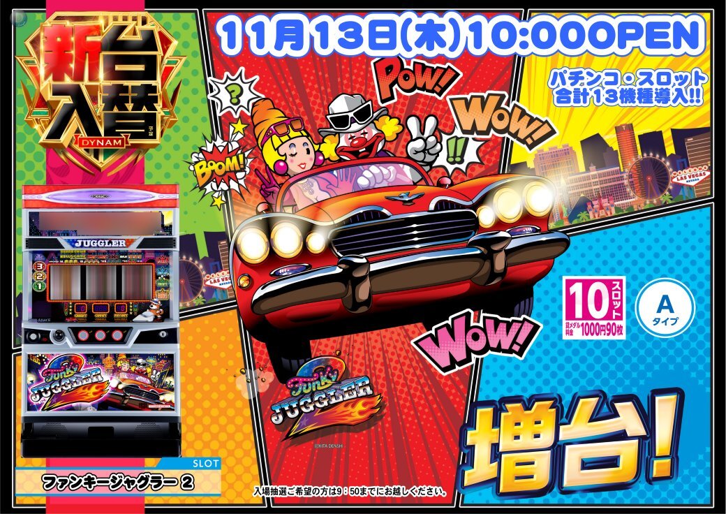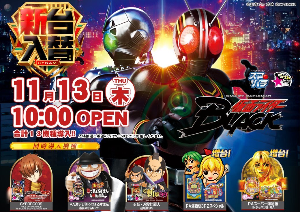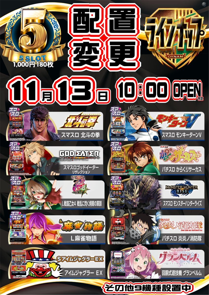 こんばんは😀 ◆━━━━━━━━━━━◆ ダイナム福岡飯塚花瀬店 📢11月13日(木)📢 ⭐新台入替⭐ ◆━━━━━━━━━━━◆ 抽選は9:50開始‼️ ラインナップは🔽コチラ🔽 #ダイナム pic.x.com/tfcBoxRrNN