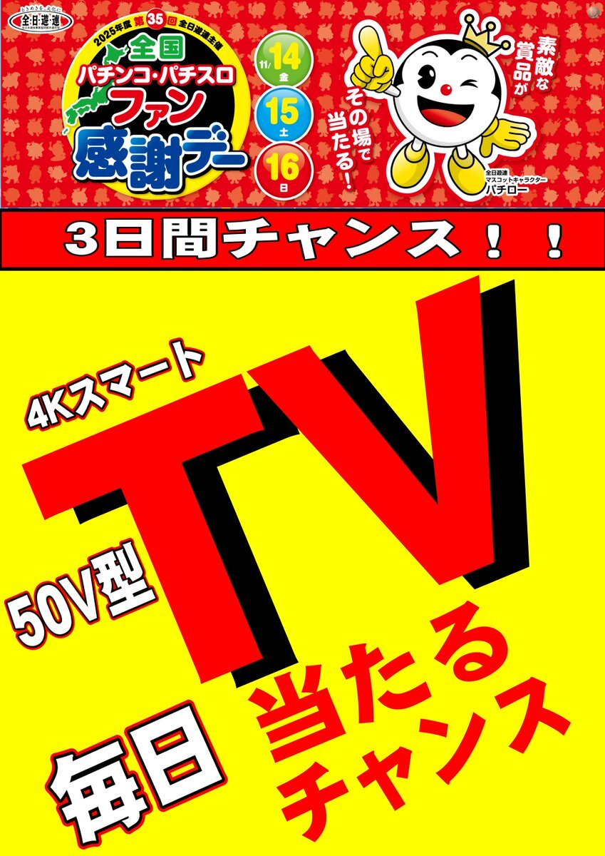 🎉11月14日・15日・16日🎉 🎉パチンコ・パチスロファン感謝デー🎉 今回のファン感は… 💖毎日TVが当たるチャンス💖 ⏱️抽選時間(全日共通)⏱️ ①11:00 ②15:00 ③17:00 ④19:00 ‼️3日間とも抽選回数は4回‼️ ‼️皆様奮ってご参加下さい‼️ #ダイナム #パチンコ #パチスロ pic.x.com/xB1JNiJmJ2