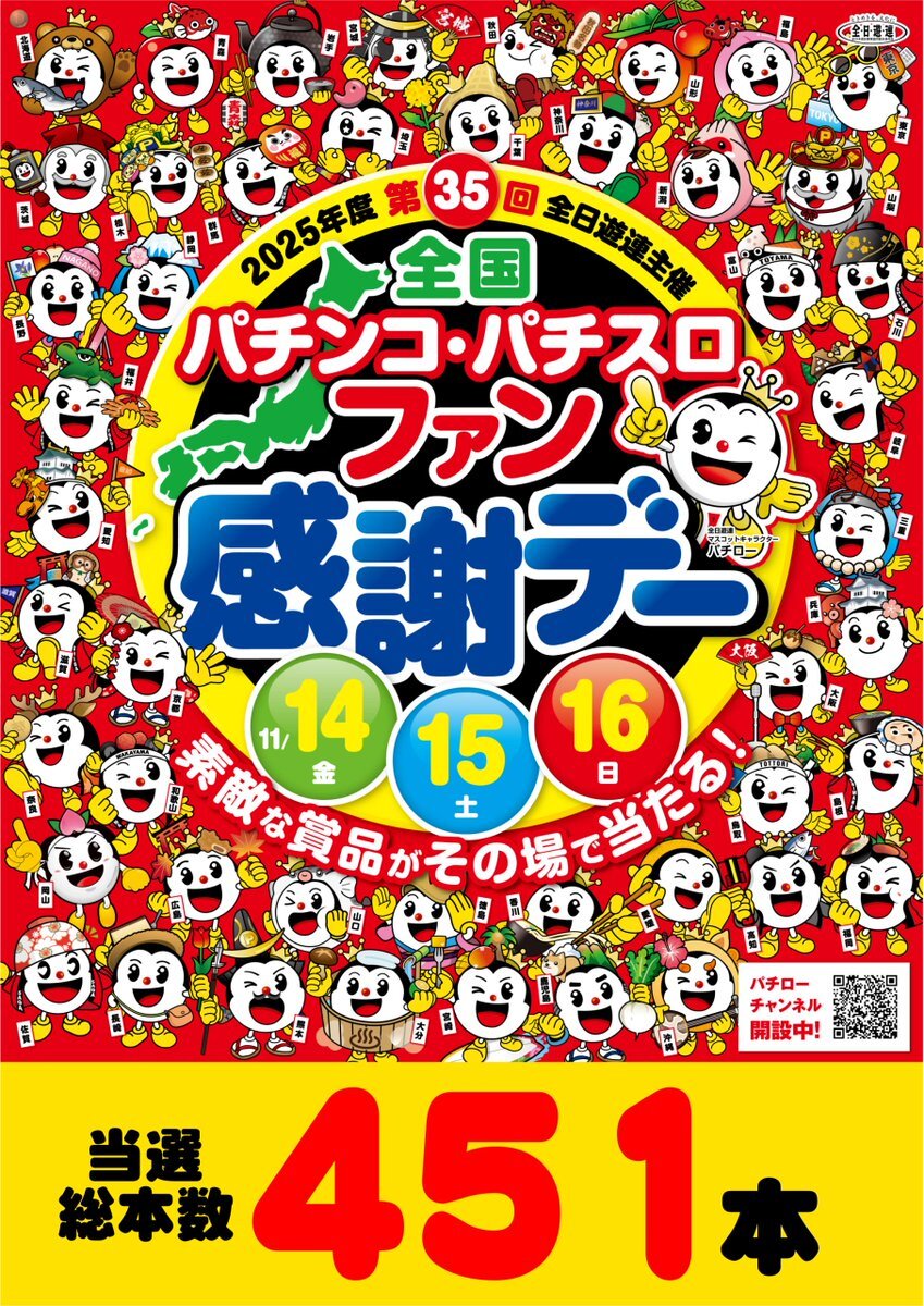 #全国パチンコ・パチスロ ファン感謝デー 【開催期間】 ▶️#11月14日(金) ▶️#11月15日(土) ▶️#11月16日(日) 🎯当選本数はなんと❗451本 みんなきてね🎈 #ダイナム #国分店 #パチンコ #ファン感 pic.x.com/NTMKRPj7dW