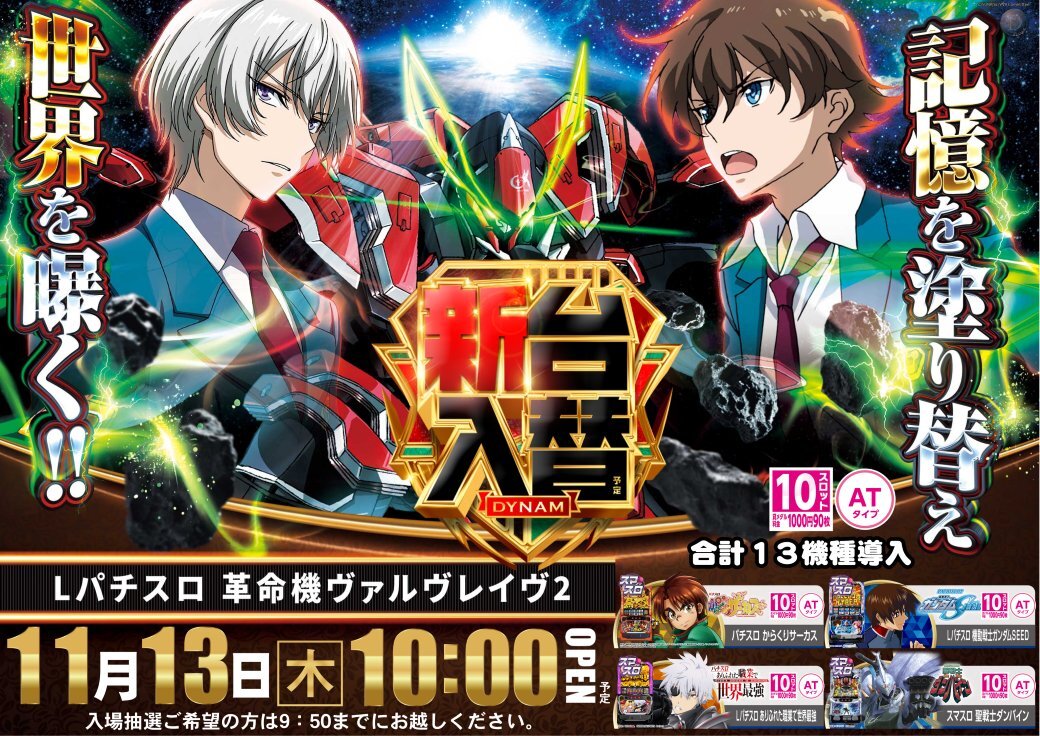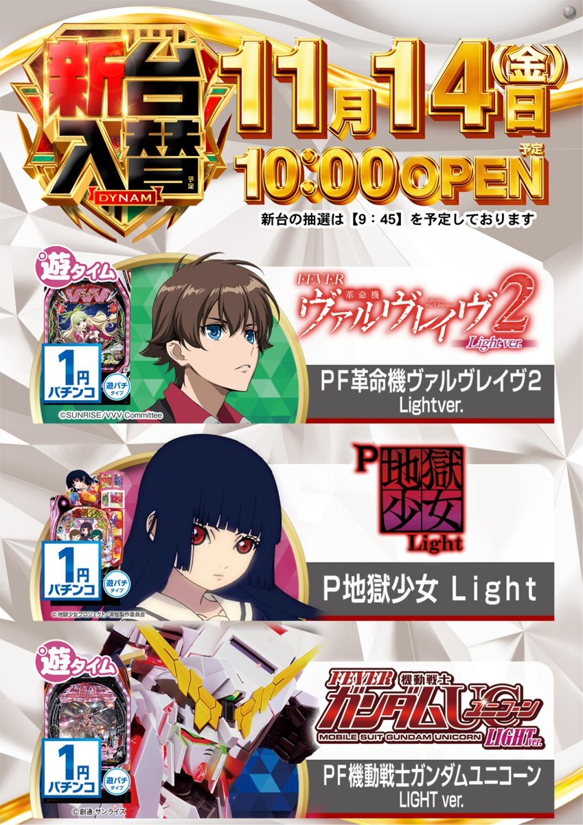 ダイナム滋賀愛知川店です❗ 🆕🆕🆕11.14(金) 🆕🆕🆕 👇導入機種はコチラ ✅PF革命機ヴァルヴレイヴ2 Lightver. ✅P地獄少女 Light ✅PF機動戦士ガンダムユニコーン LIGHT ver. ご来店お待ちしています😁✨ #ダイナム #新台入替 pic.x.com/kydjIDLaXn
