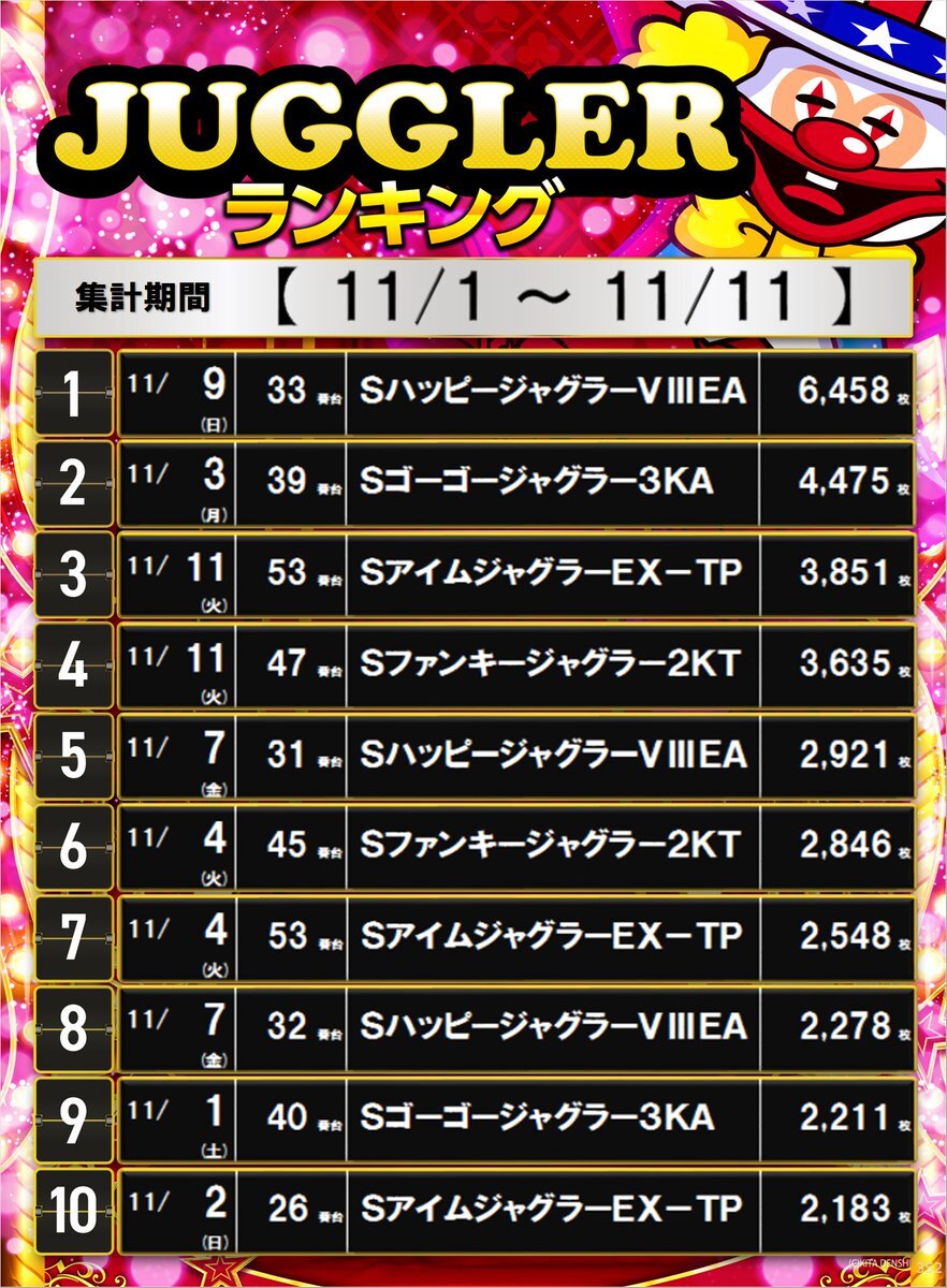 🎺今月のジャグラーランキング速報🎺 11/9(火)ジャグラー景品入荷日の ✨Sハッピージャグラー✨ ✨堂々第1位✨ 6,000枚over✨✨ おめでとうございます!(^^)! 次回の景品入荷もお楽しみに~♬ #ダイナム #ジャグラー pic.x.com/i3gdPOjCoq x.com/dynam_00352/st…