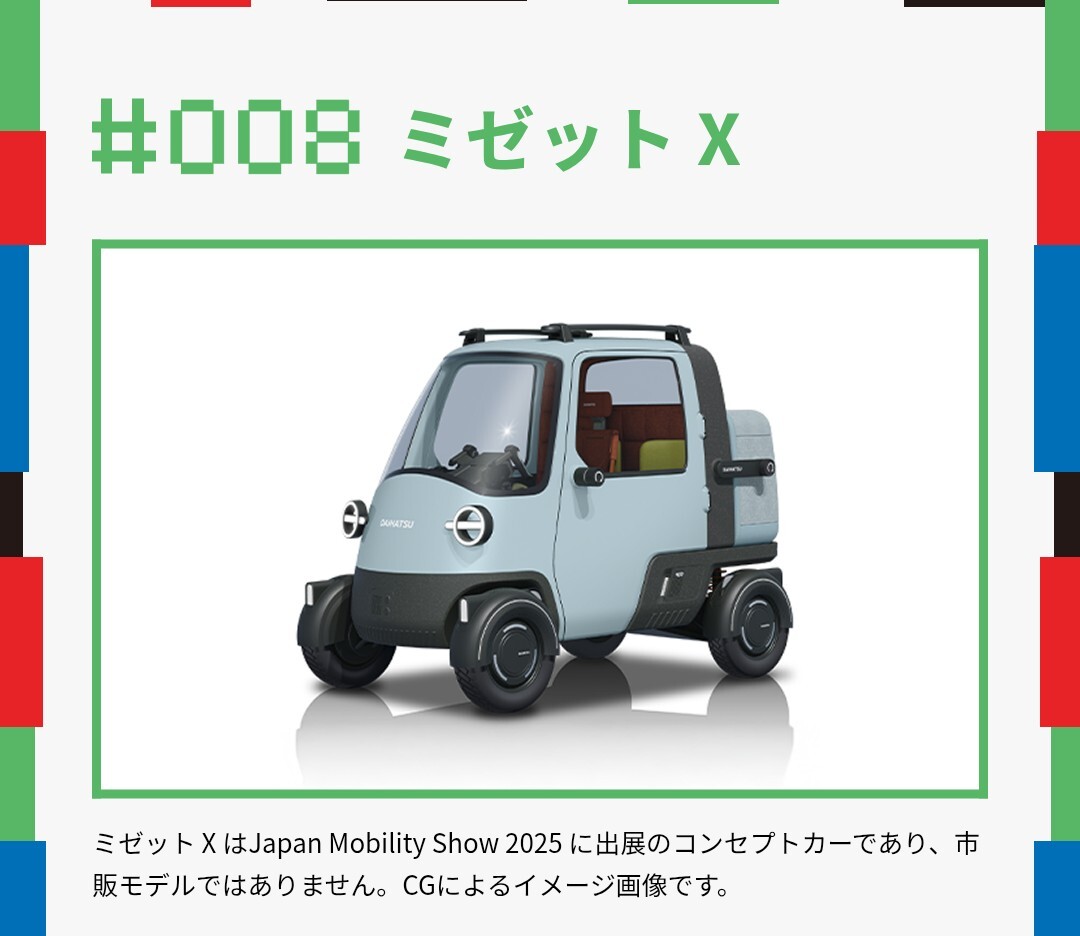 \Japan Mobility Show 2025に出展!/ ダイハツは、"わたしにダイハツメイ。"をテーマに、原点であるミゼットを基点にひろがる未来の姿をブース展示・演出で表現します✨ 「ミゼットX」をはじめとした多彩なコンセプトカーを出展! 詳細は10/29(水)のプレスデーで公表します🚘
